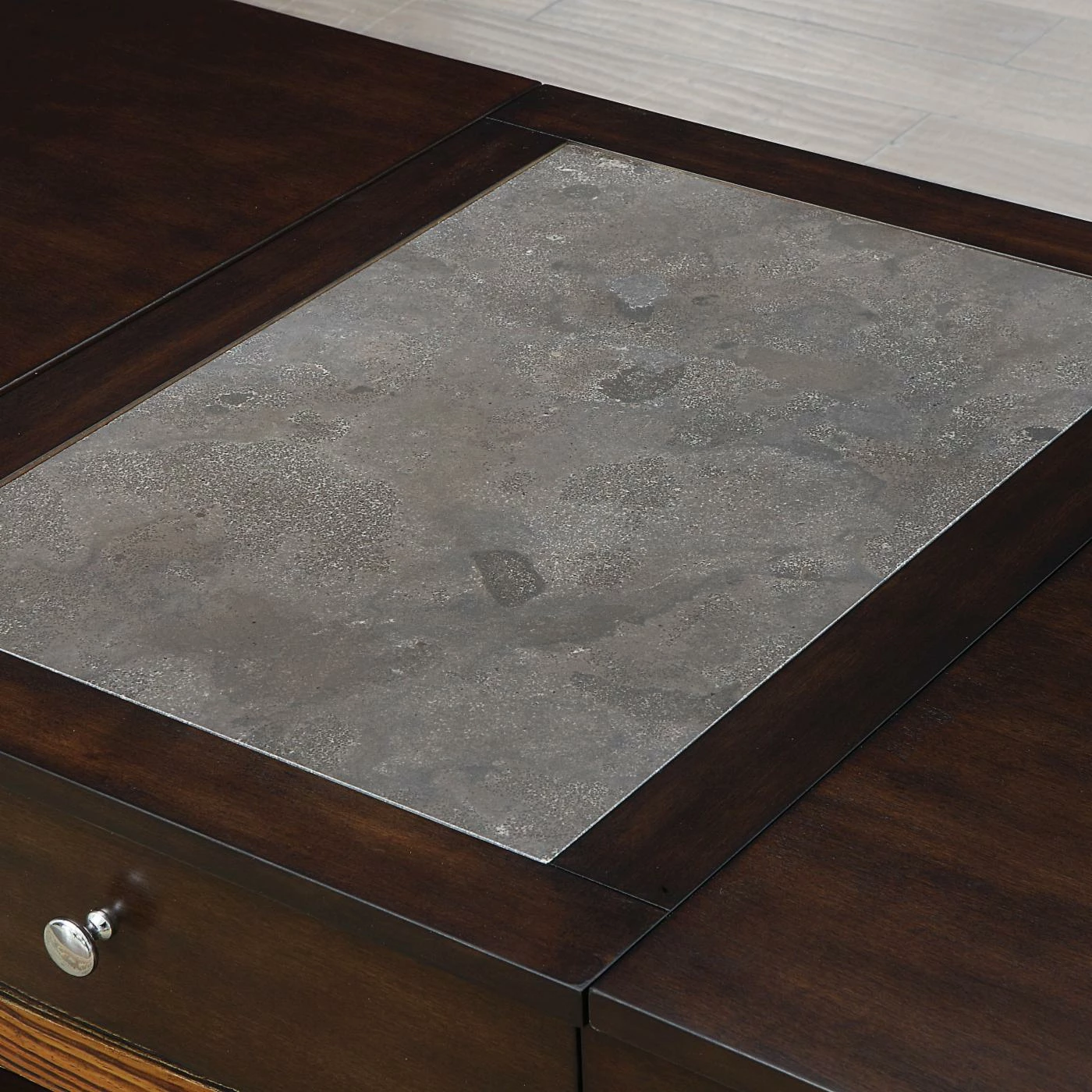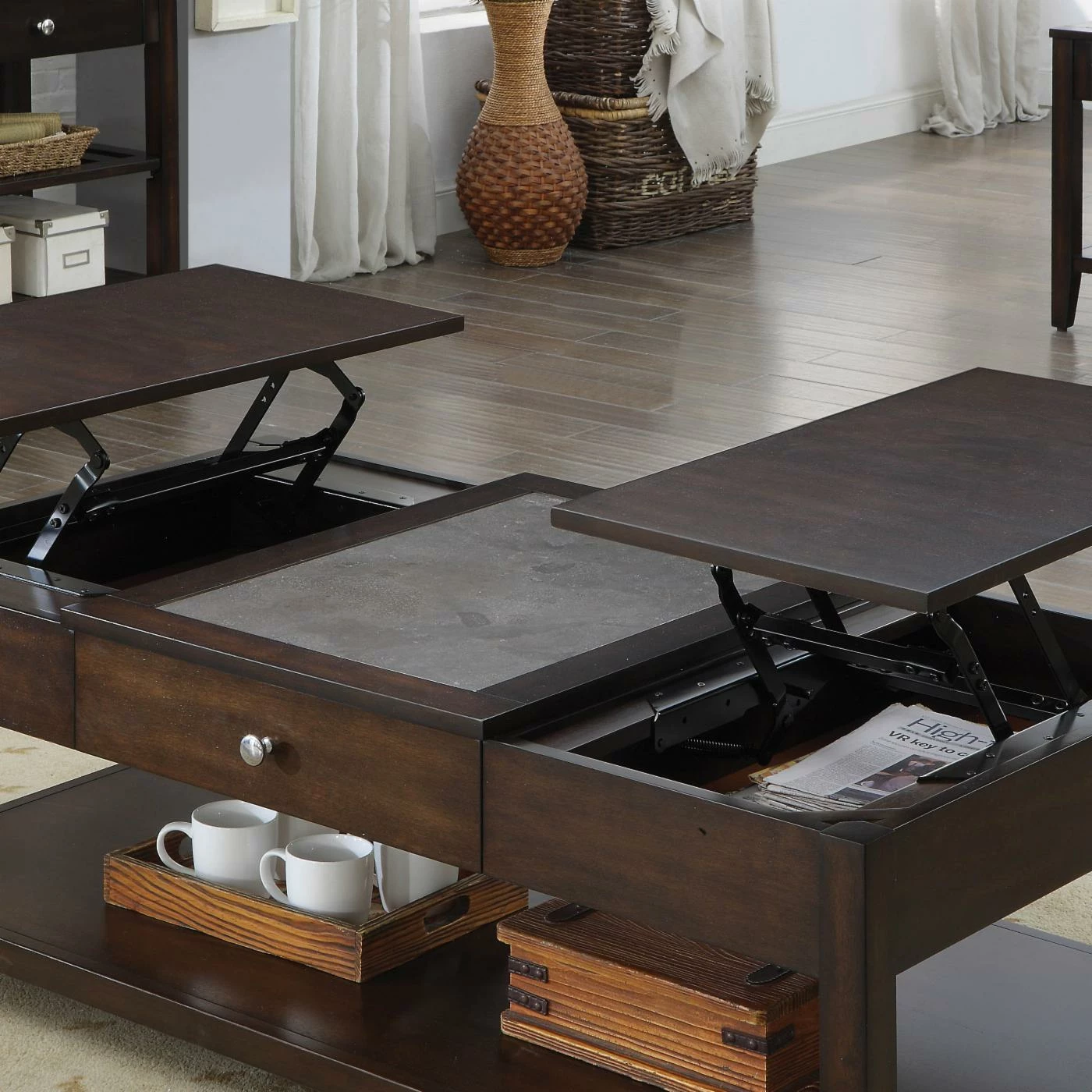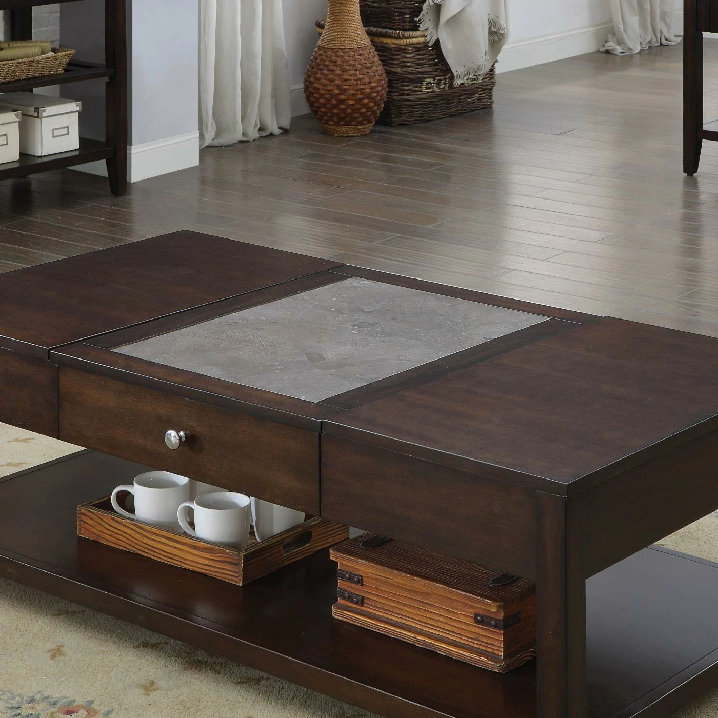 The Furniture of America Norton Celestite Lift Top Coffee Table is ready to be whatever you need it to be. At first glance, you get a simple coffee table with a single drawer and a lower shelf. When you investigate further, you find that either side of the tabletop can be lifted up on heavy-duty hinges to reveal interior storage. While open, you can also use the raised surfaces as a place to work, eat, or read. The body of this table is made from solid wood with an exterior of wood veneers under an espresso-toned finish. At the center of the tabletop is a thick, inset panel of celestite mineral that adds an organic touch to the design.