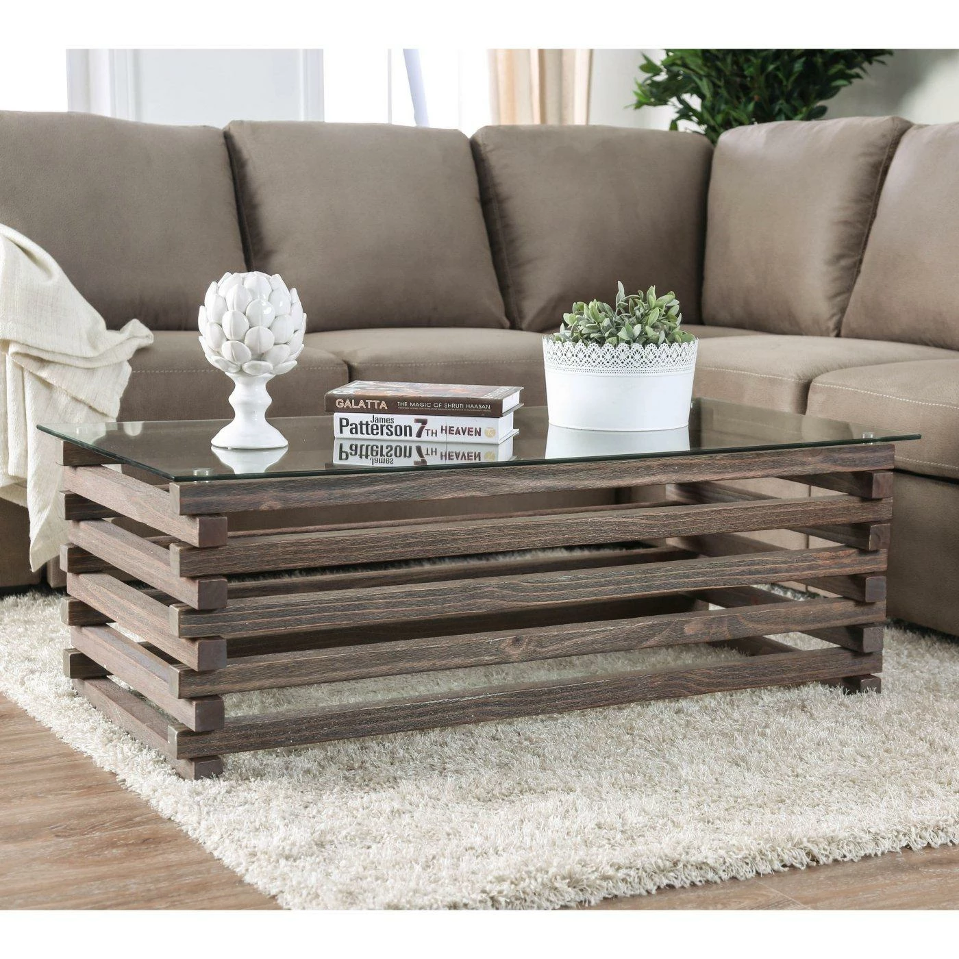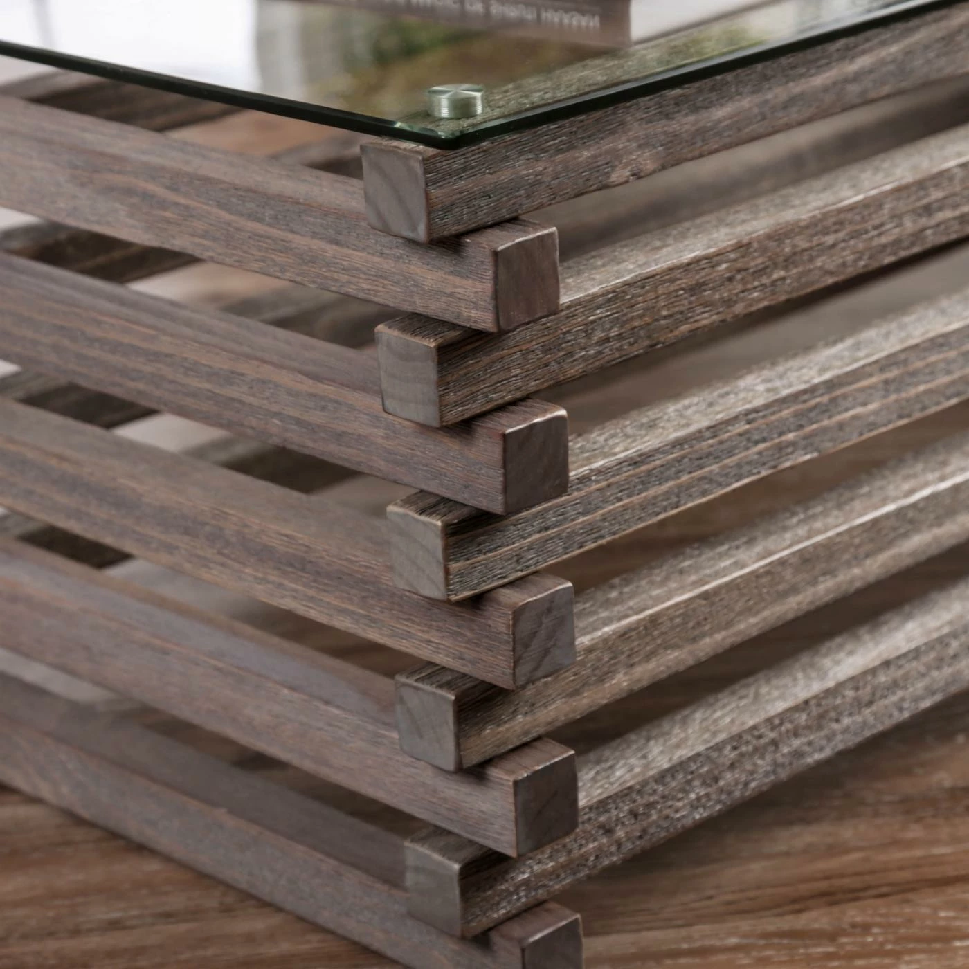 Plan a completely new feeling to your living room with the HN Home Colwell Modern Farmhouse Industrial Gray Coffee Table. This rectangular table is a wonderful addition to any modern setting. Its cubic base is made from long, squared planks of wood stacked atop one another. A distressed rustic gray finish tops the wood. The tabletop is made from a clear piece of tempered glass.