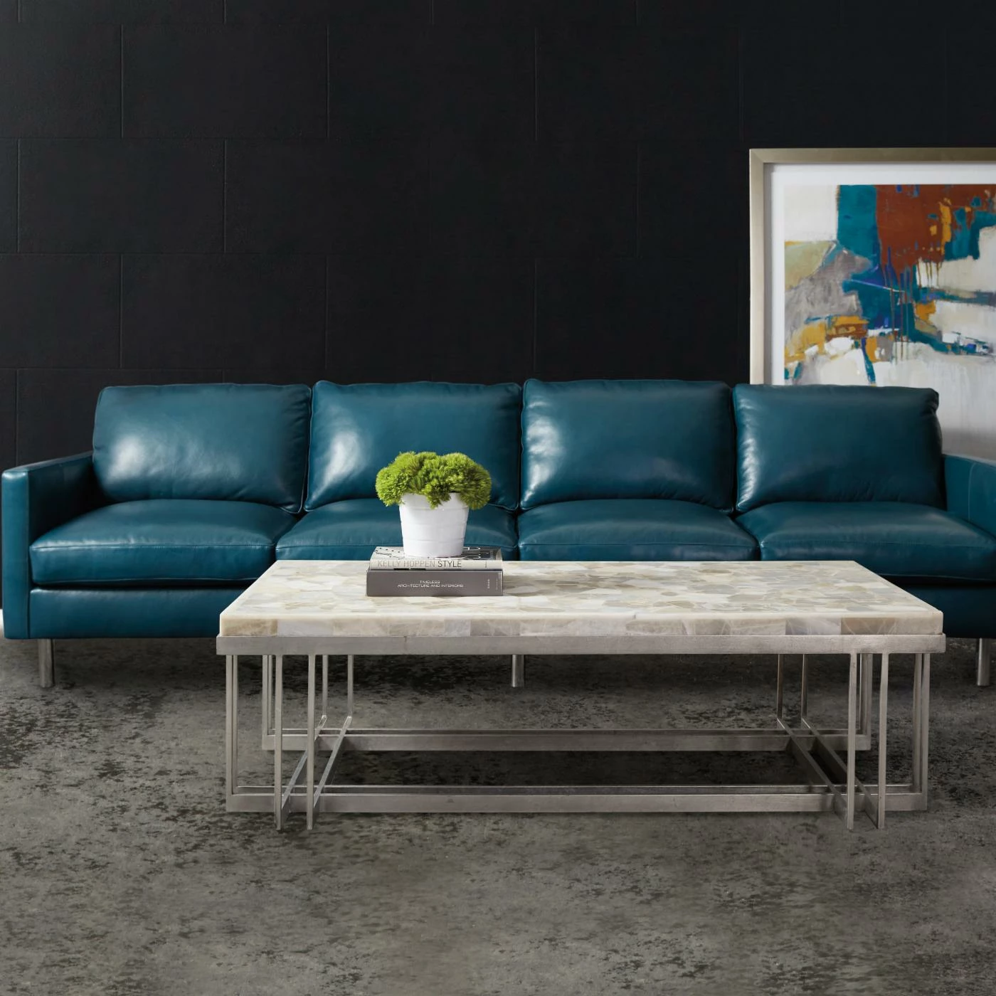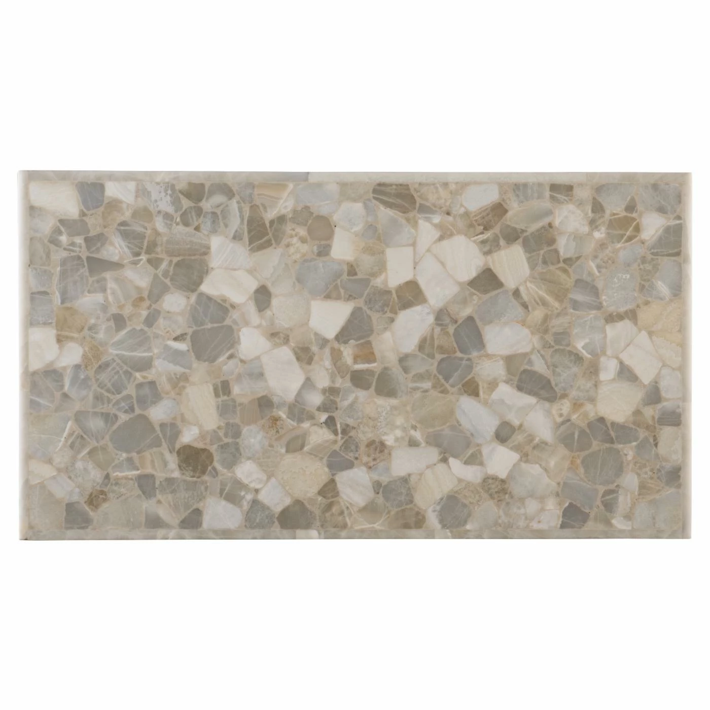 Settle into your new cutting-edge living room with the Hooker Furniture Melange Marin Rectangle Cocktail Table as a charming centerpiece on which to serve drinks or set up a focal-point display. The base features four double-layered, interlocking sled legs made from metal. A brushed pewter finish tops the metal and emphasizes the sharp lines. Tumbled white onyx forms the top, featuring a faceted, mosaic-style look.
