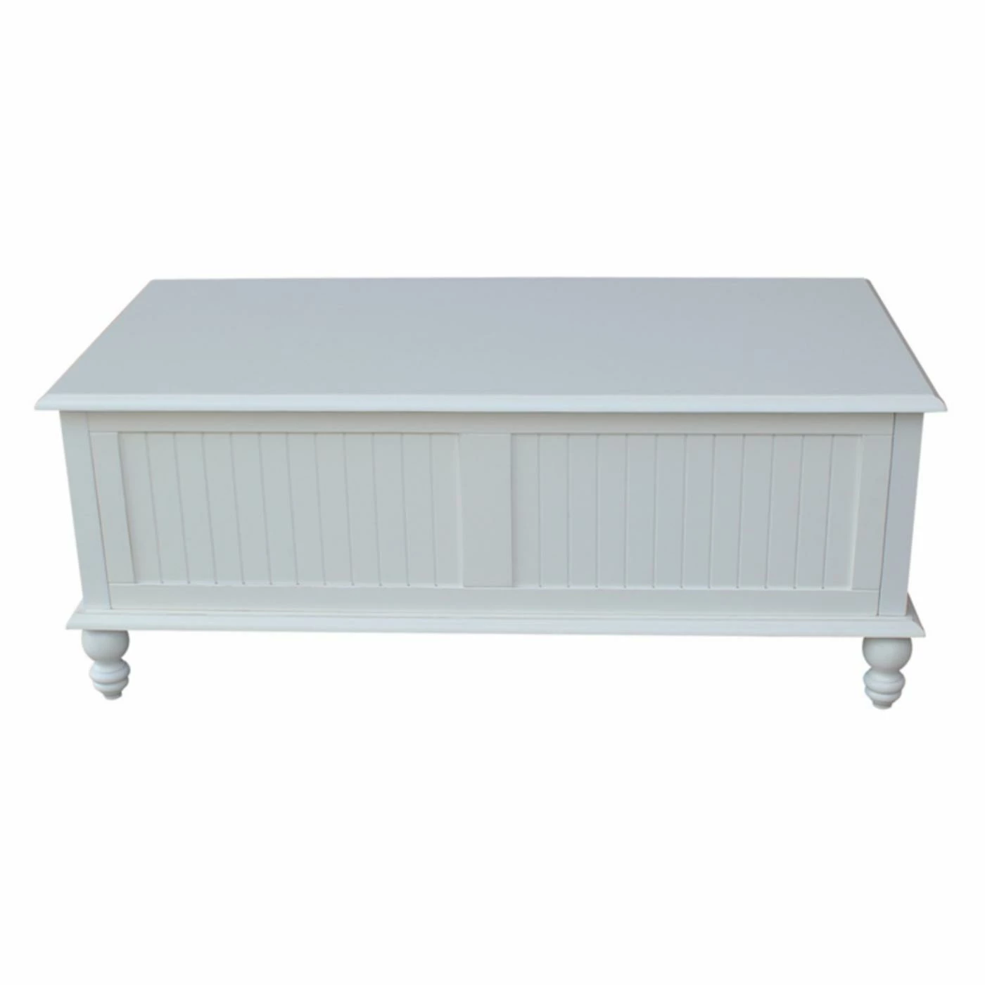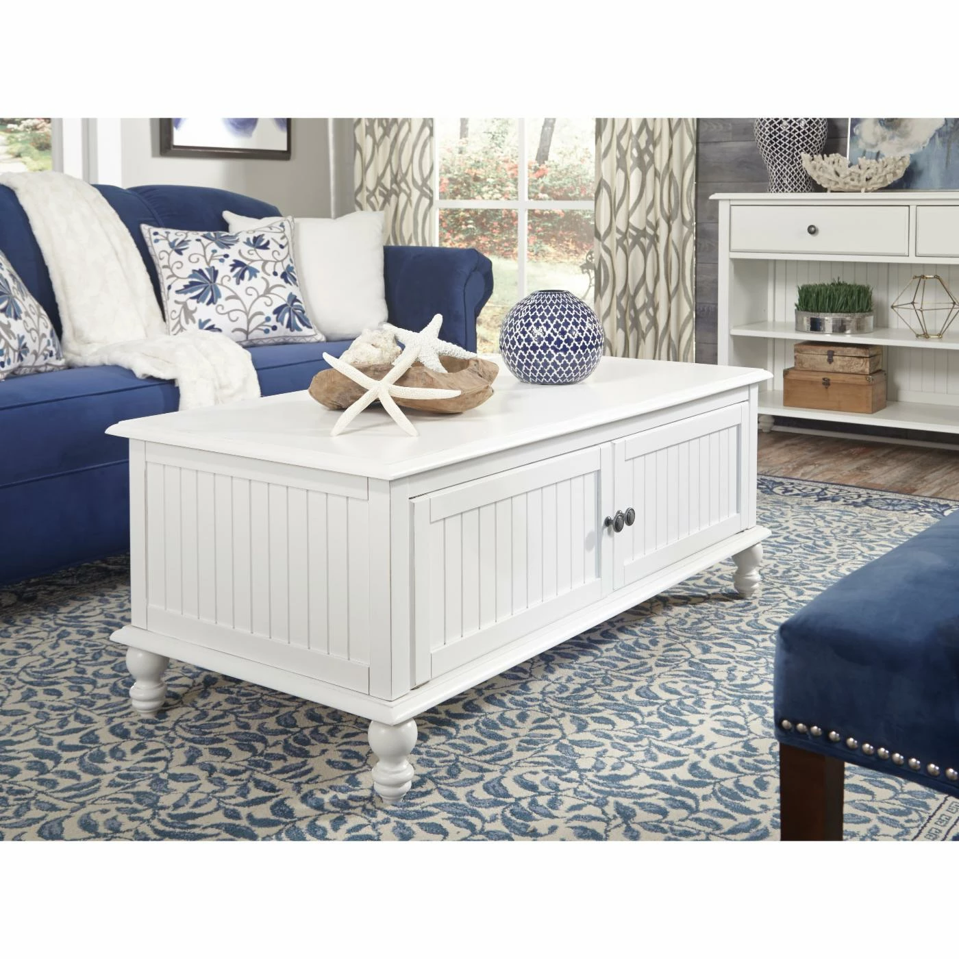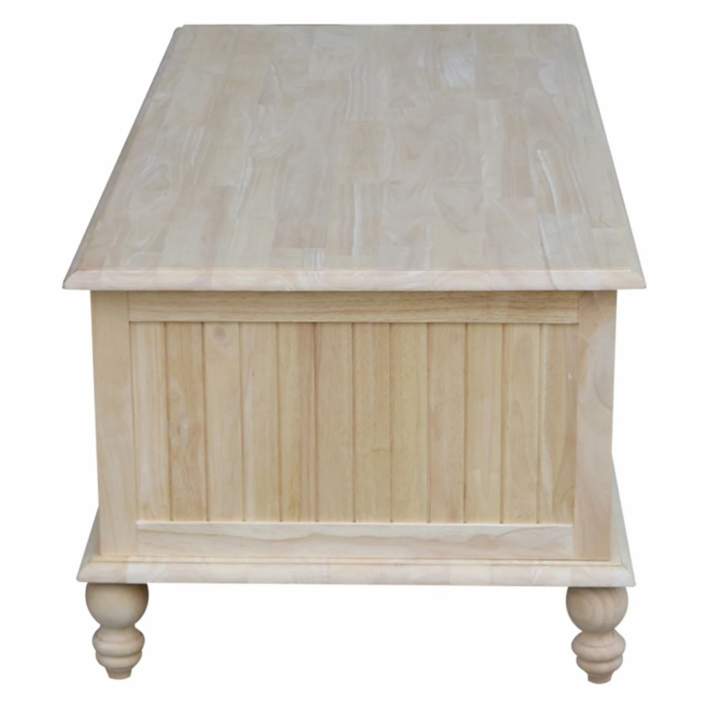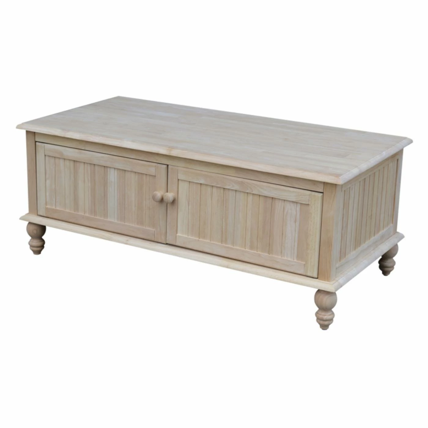 The International Concepts Cottage Rectangular Coffee Table shows a true love for traditional furniture design. This wide table is made from solid pine hardwood that’s offered in a full range of finishes, stands on turned bun feet, and has the distinctive look of vertically oriented beadboard. The paneled wooden doors have turned wooden knobs and magnetic latches to keep it closed. The low design of this piece makes it suitable as a table or TV stand.