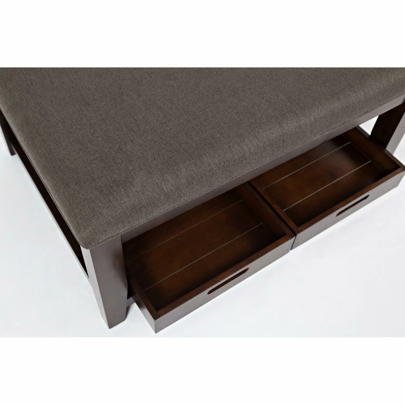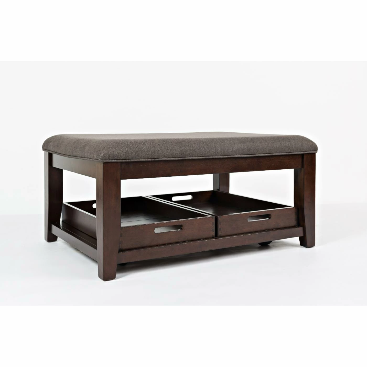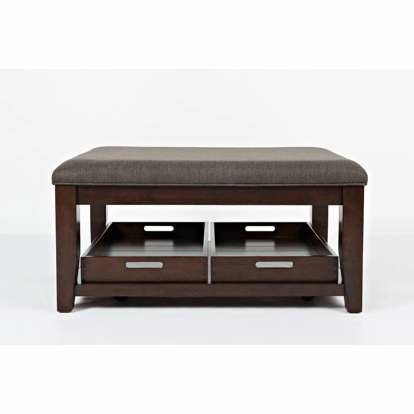 Versatile and stylish, the Jofran Twin Cities Ottoman Cocktail Table is a must-have for any modern family. Its upholstered top transforms this cocktail into an ottoman that’s great for putting your feet up, while the two trays, which store neatly on the bottom shelf, are perfect for holding meals or to be used as serving trays. Plus, the fabric is stain- and moisture- resistant, as well as easy to clean, so it’ll look chic for years. Crafted from wood, and finished in dark brown, this cocktail table is versatile and designed to last.