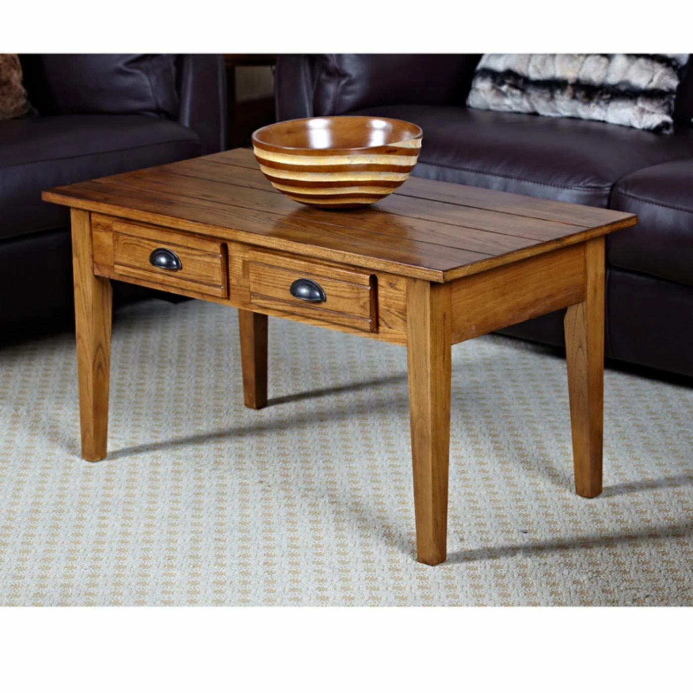 The Leick Home Bin Pull Oak Two Drawer Coffee Table is a highly practical furniture piece that adds casual elegance to your home. This coffee table is made with a solid ash planked top and oak veneers. It is finished in a warm candleglow that allows the natural wood grain to show through. This coffee table is inspired by traditional Shaker/Mission furnishings and features two dovetailed, solid wood drawers with blackened metal bin pulls. It has a generously sized top for display and is 38W x 20D x 20H inches.