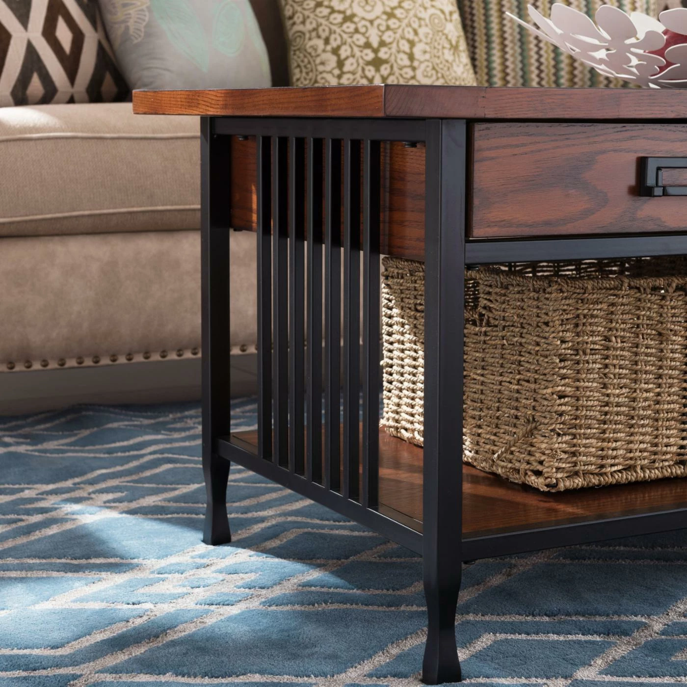 The slatted sides on the Leick Home Ironcraft 2 Drawer Coffee Table draw their inspiration from classic Mission design. They’re part of this coffee table’s blackened steel frame, which, along with the solid hardwood and oak veneers, creates a classic appeal in any living space. The burnished medium oak finish highlights the natural grain of the wood, while a lower display shelf and two drawers with full-extension ball bearing glides offer handy storage.