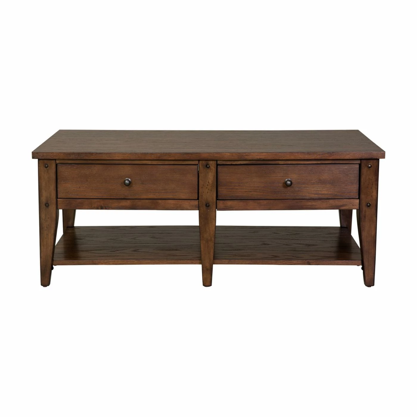 With its appealing planked top and tapered legs, the Lake House Coffee Table is a wonderful accent in almost any dΓ©cor. Constructed of hardwood solids with oak veneers in your choice of finish, this traditional-style coffee table is the perfect complement to today’s upholstery styles. Antique brass pulls beautifully highlight the warm finish. Two push-through drawers offer storage for remote controls, a deck of cards, and other small items, and the veneered lower shelf provides further display and storage space. Dimensions: 48W x 27D x 19H inches.
