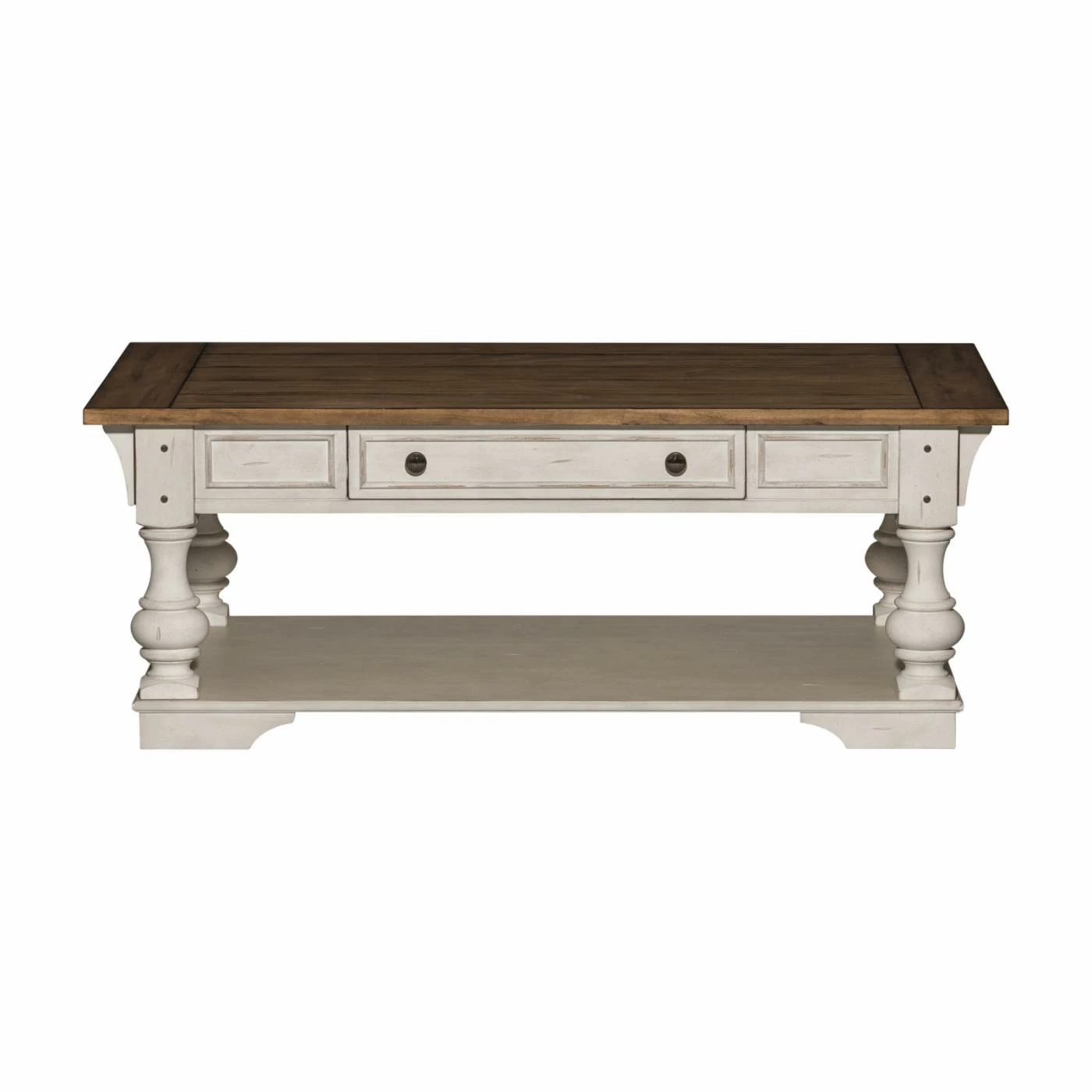 Decorate the slat style top of the Liberty Furniture Industries Morgan Creek Cocktail Table and have plenty of space around it for your next book club meeting. Keep your remotes organized in the single drawer with double round handles in a silver finish. The bottom shelf will hold folded blankets, books, or decorative items. This cocktail table is constructed from poplar solids with birch and pine veneer. The two-tone antique white and wire brushed tobacco finish will add a rustic touch to your home. Pair this piece with other items from the Morgan Creek Collection to complete your home in elegant style.