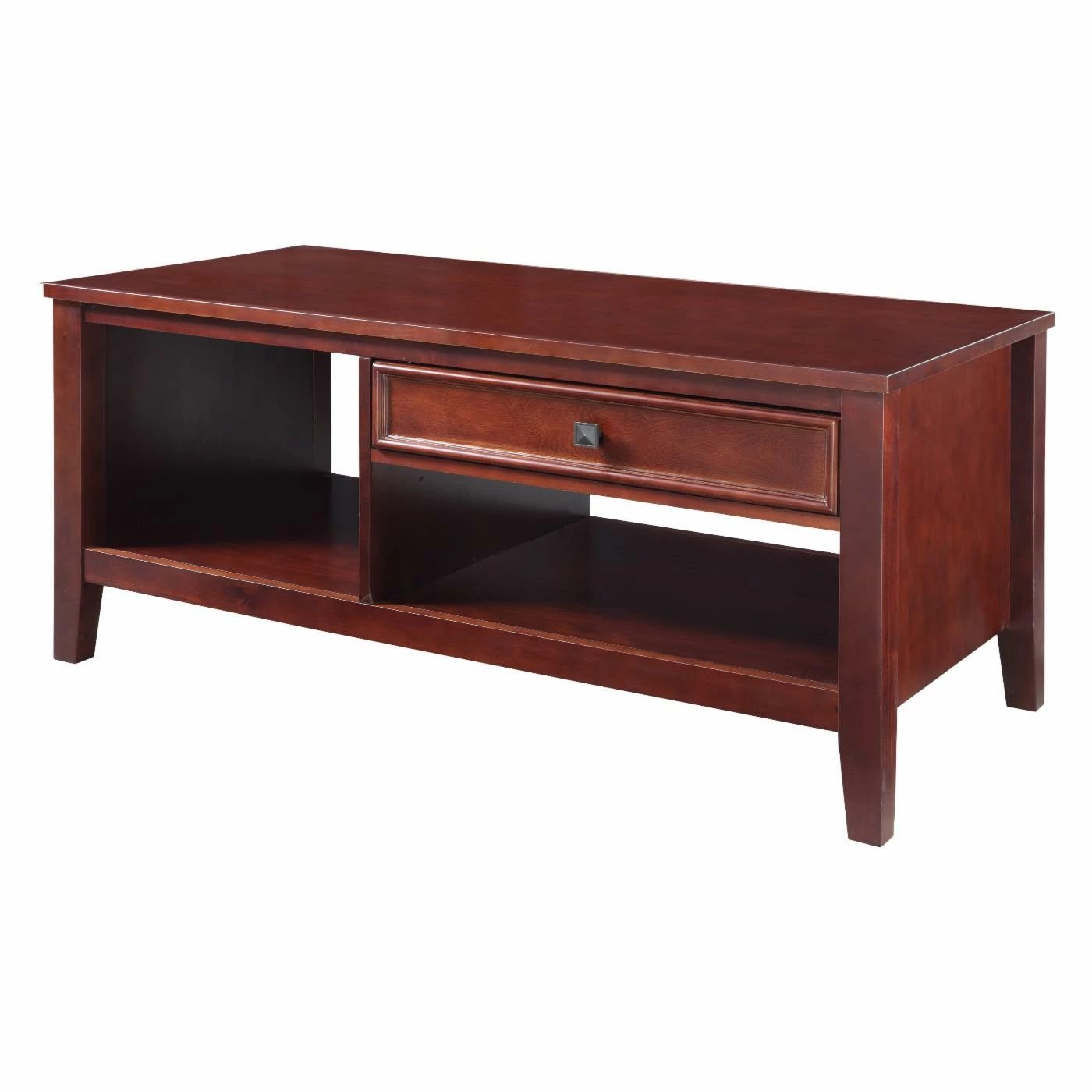 The versatile design of this Linon Home Wander Coffee Table includes a warm cherry finish, tapered legs, and rectangular hardware in a burnished bronze finish. As practical as it is stylish, this coffee table boasts a spacious top, single drawer, and two open shelves.