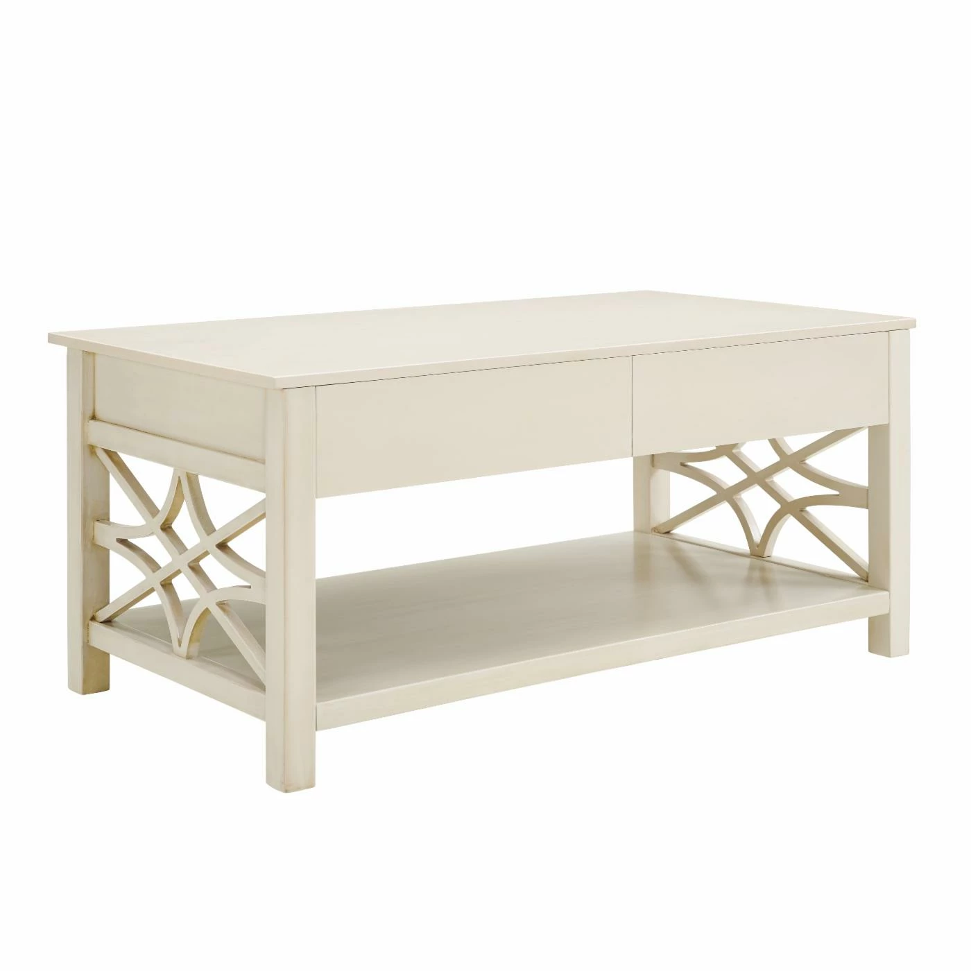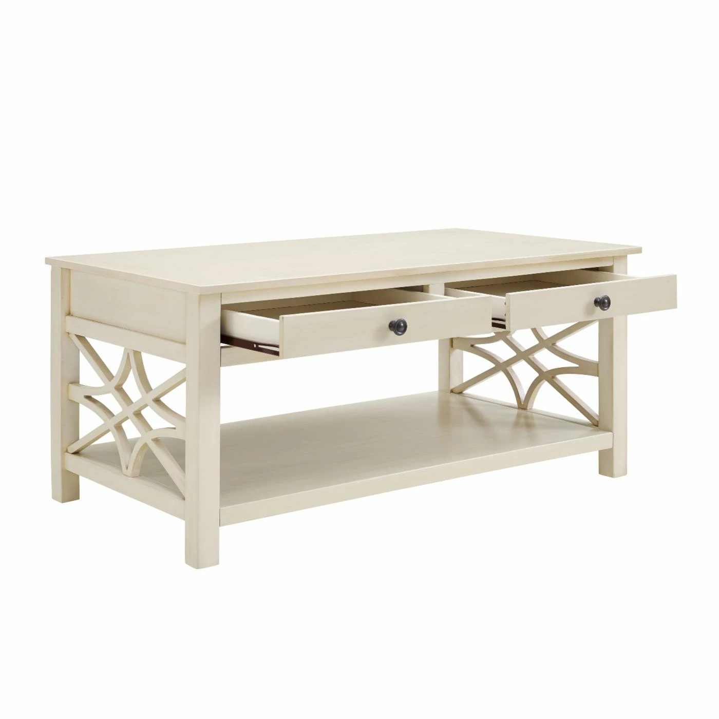 Keep your living room decor charming and elegant with the . Featuring a geometric design along the sides and an antique white finish over the pine and engineered wood frame, this piece instantly elevates your decor. Two easy-glide drawers are perfect for holding remotes and devices while the bottom shelf is ideal for magazines, books, or a decorative item.