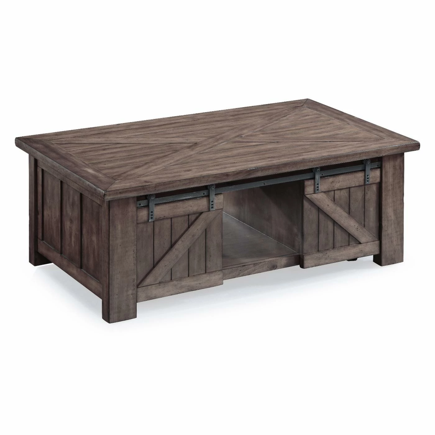 Solidify your living room in traditional style with this rustic Magnussen Garrett Rectangle Cocktail Table. Constructed of pine solids, this cocktail table exudes strength while invoking feelings of a charming cottage experience. A lift-top design feature includes four sliding doors with a long metal rail and casters for easy mobility. Includes blackened pewter hardware. You will enjoy hosting guests around the new centerpiece of your main social living space, which comes in an inspired, cozy weathered charcoal. The spacious Magnussen’s Garrett cocktail table easily has room for several beverages, reading materials, or a planted centerpiece.