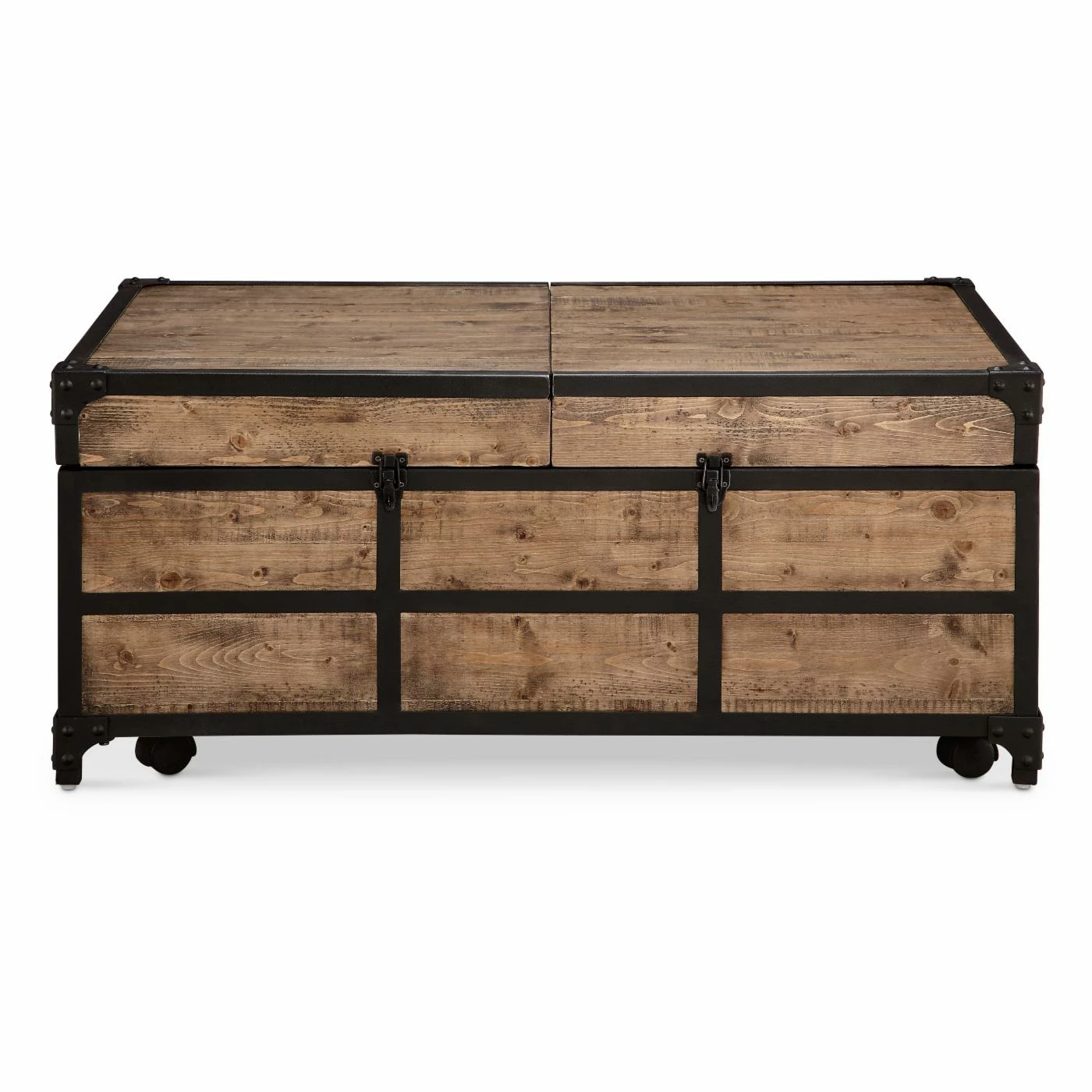 The vintage steam trunk is the inspiration for this Magnussen Maguire Rectangle Cocktail Table. That inspiration translates into a bold, classic addition to your bedroom or living room. As the centerpiece to your main social living space, guests will love gathering around the “trunk” for conversation and coffee or cocktails. Industrially designed, the table combines a traditional wooden construction in a weathered barley finish with a striking black metallic frame. The cocktail trunk features a removable tray, plus casters and an enormous amount of storage space. The seemingly endless design features include black metal rivets and latches.