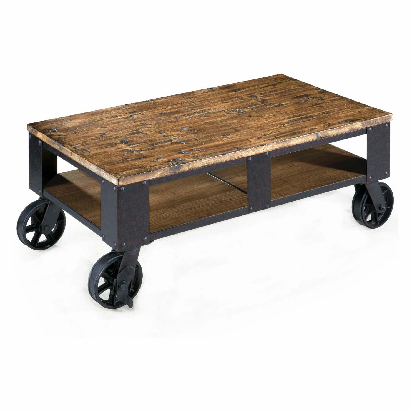 The Magnussen T1755 Pinebrook Wood Rectangular Coffee Table with 2 Braking Casters is a modern-day piece with a classic reclaimed-style look. Made from fine pine solids, this piece is aged with a distressed natural pine finish that gives it a weathered charm. A sturdy iron frame supports the piece, featuring riveted accents and casters (two of the casters feature brakes to ensure this piece is easy to move, but stays put when needed).