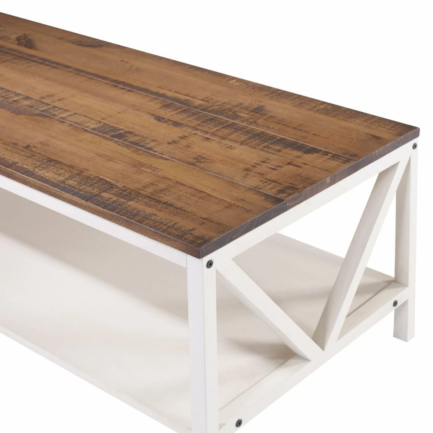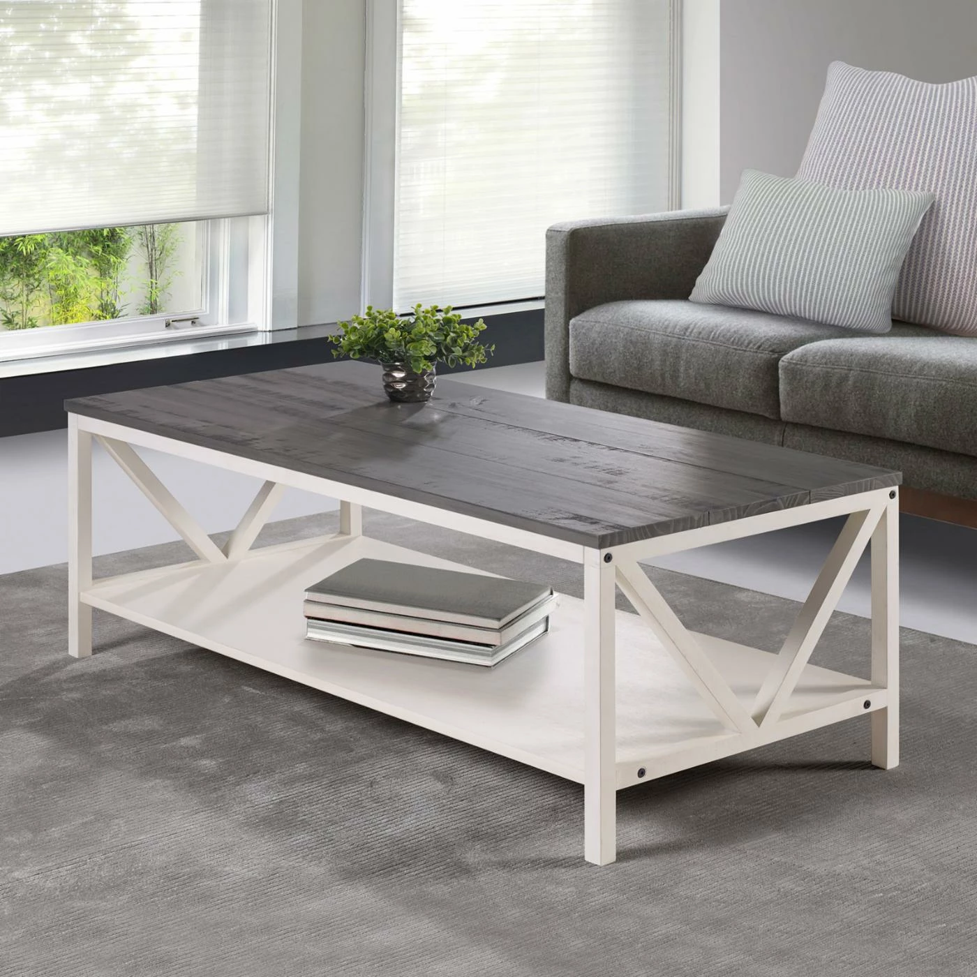 Reinvent your living room into a place that welcomes relaxation and being oneself with the Manor Park Modern Farmhouse Distressed Coffee Table. This coffee table has a distressed top thatโs a great place for your shabby-chic mugs or reclaimed decorative pieces. The piece is made from durable pine hardwood solids and engineered wood. Block legs with slanted side accents support the piece, featuring a wide lower shelf for out-of-the-way storage. Make the table your own with your choice of available color option.