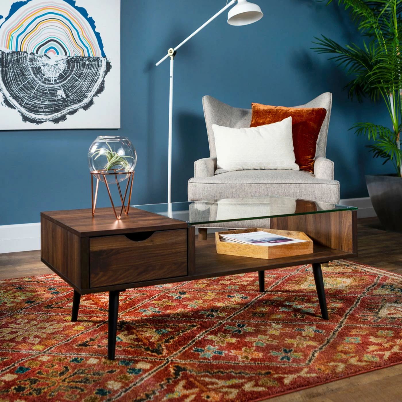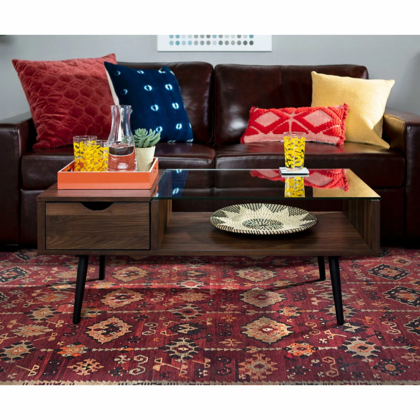 The Manor Park Wood and Glass Coffee Table lends your living room an attractive mid-century modern centerpiece. The tempered glass top provides a convenient spot to store magazines, books, or trinkets, and it contrasts beautifully with the wood laminate. A drawer and bottom shelf offer additional storage space. Assembly required.