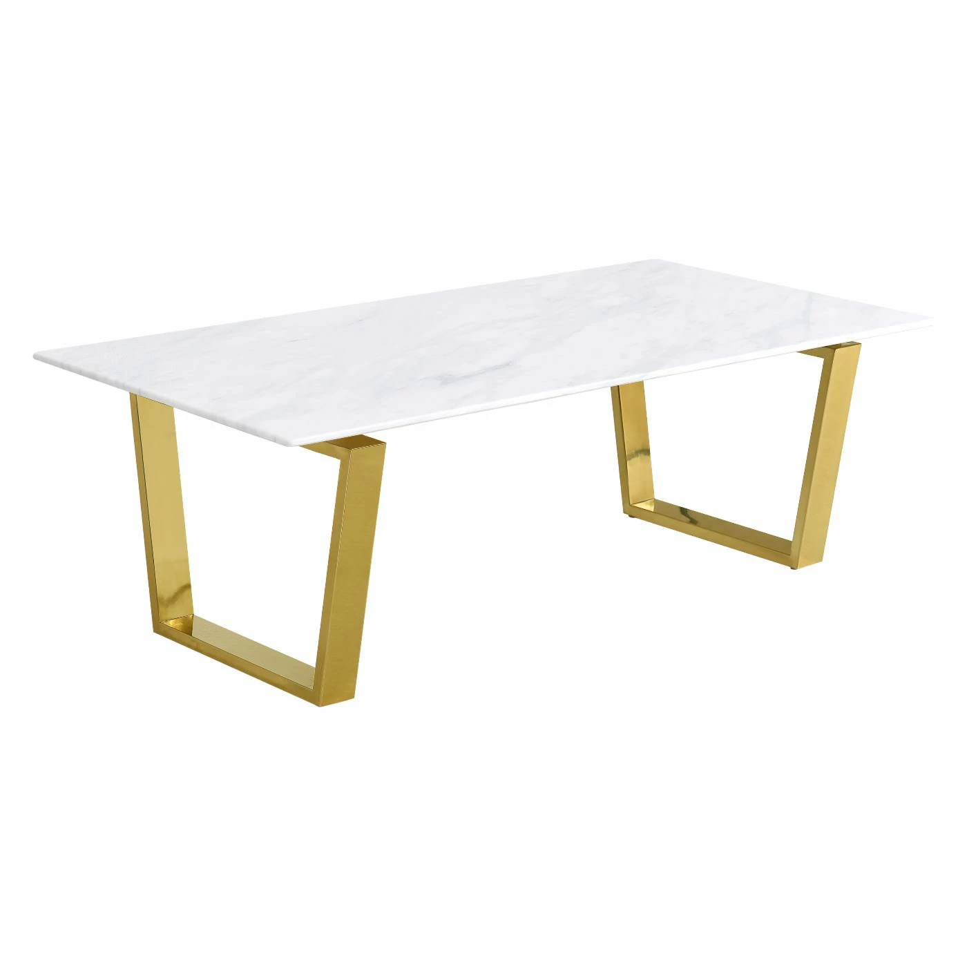 Invite modern glamour into your living room design by styling the Meridian Furniture Inc Cameron Gold Coffee Table in front of your sofa or sitting area. A genuine slab of white marble is perched atop a glam gold-finished stainless steel base, making this coffee table practical and stunning. Combine it with other occasional tables in the Cameron collection for a glam, modern interior you’ll be proud to display.