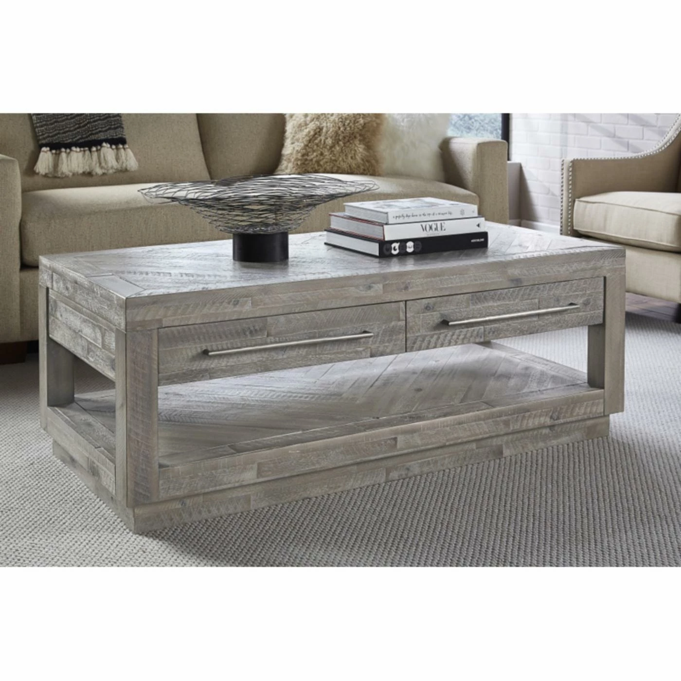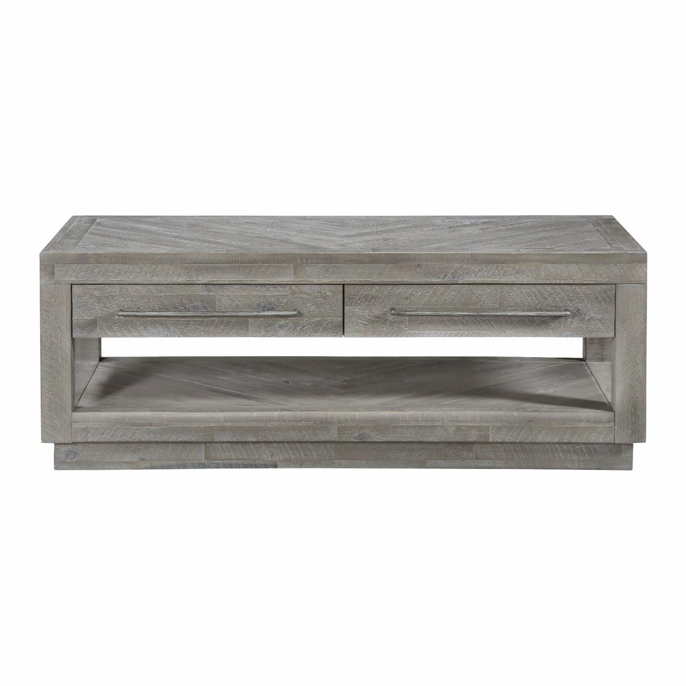 Use the spacious top of the Modus Alexandra Solid Wood Rectangular Coffee Table for decorative items and coasters while the lower shelf holds your extra blankets, magazines, or books. Your remotes and extra living room items will be neatly stored in the two spacious drawers. The top and shelf of this coffee table have a herringbone pattern that provides a contemporary element to the piece. The hand-selected planks of solid acacia wood are sanded, stained, and whitewashed for a driftwood appeal that highlights the active grain and natural knots from the milling process. The gray and rustic latte finish paired with the thin metal bar pulls in dark gray complete the unique look. Pair this coffee table with other pieces from the Alexandra Collection to complete your home with rustic-chic style.