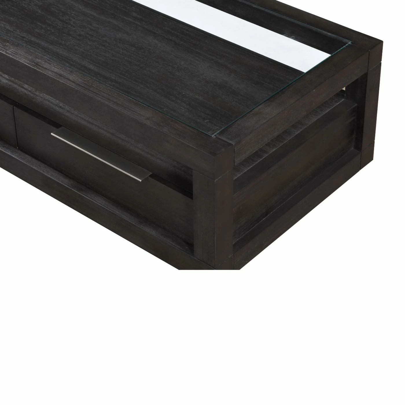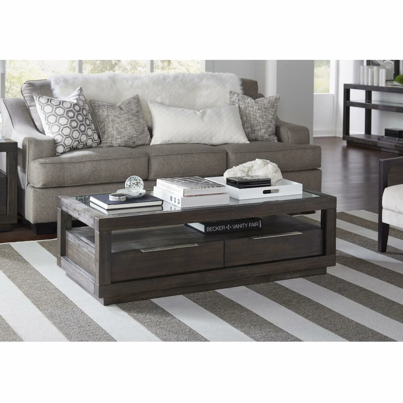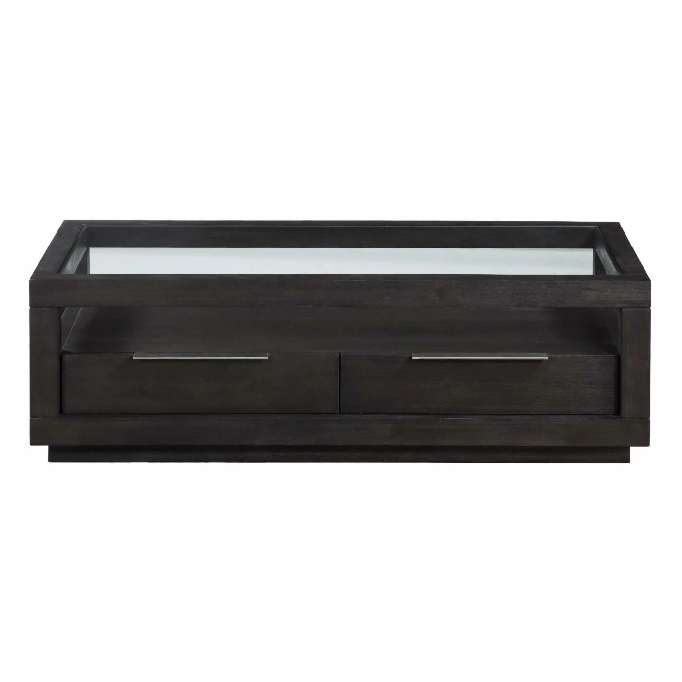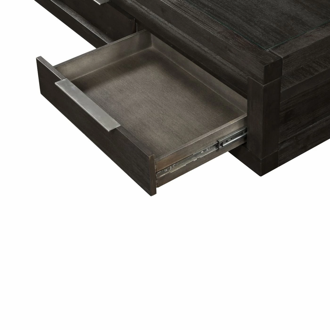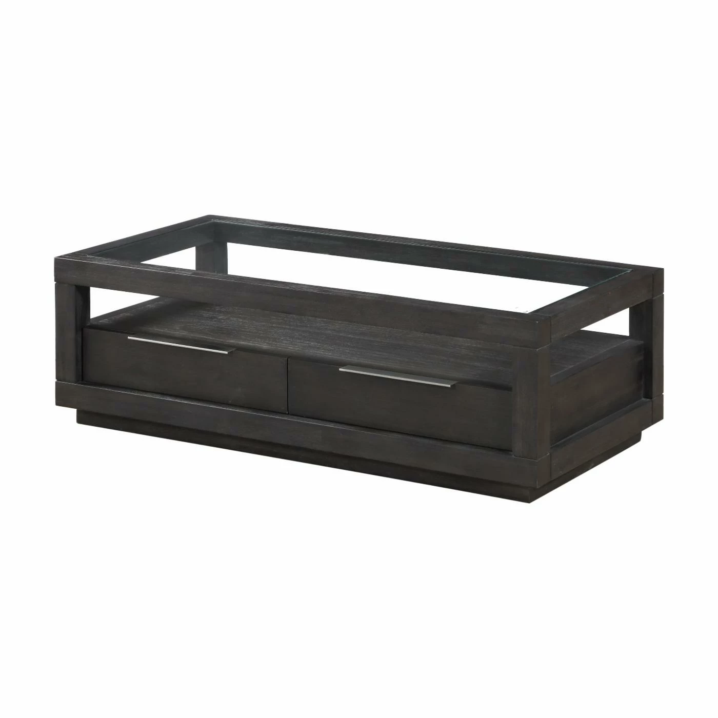 The versatile, weathered gray finish of the Modus Oxford 2 Drawer Rectangular Coffee Table complements a neutral color scheme of grays and creams, or allows vibrant jewel tones to pop. The weathered look also adds rustic appeal to this otherwise modern coffee table. It features sleek lines and a tempered, clear glass top. Add coffee table books to the open shelf and store remotes and media in the two drawers. The coffee table has a floating plinth base for added dimension.