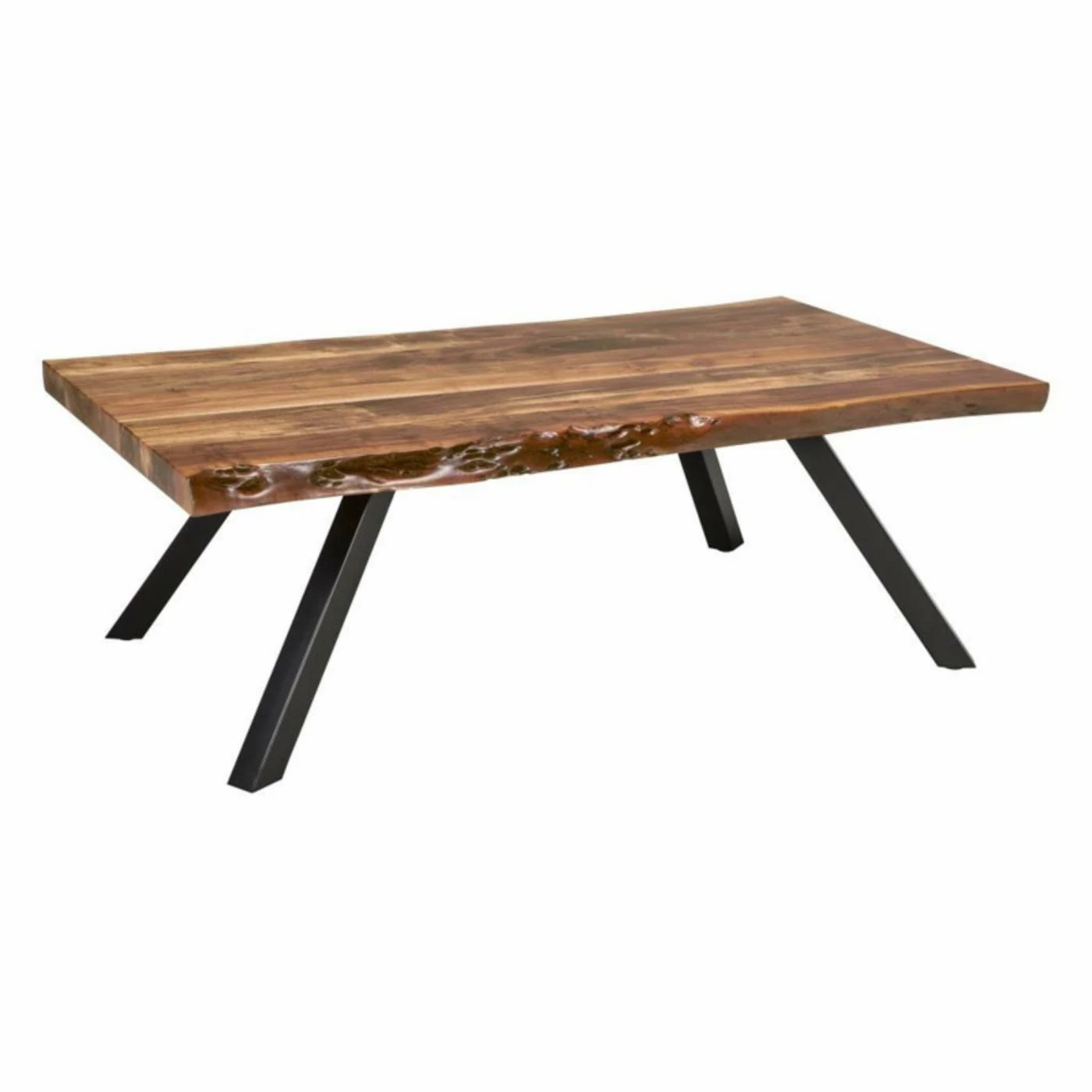 For a modern and organic look, the Modus Reese Rectangular Coffee Table is graced with a two-inch thick slab-style top with natural live edges. This rectangular cocktail table is built of solid acacia in a semi-gloss finish, and its natural edges are sanded and sealed for a beautiful, splinter-free finish. The cocktail table stands on angled iron legs in a powder-coated black finish.