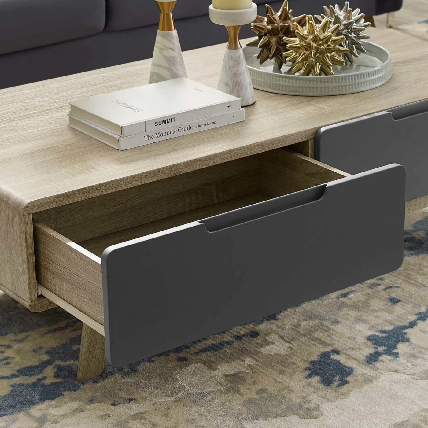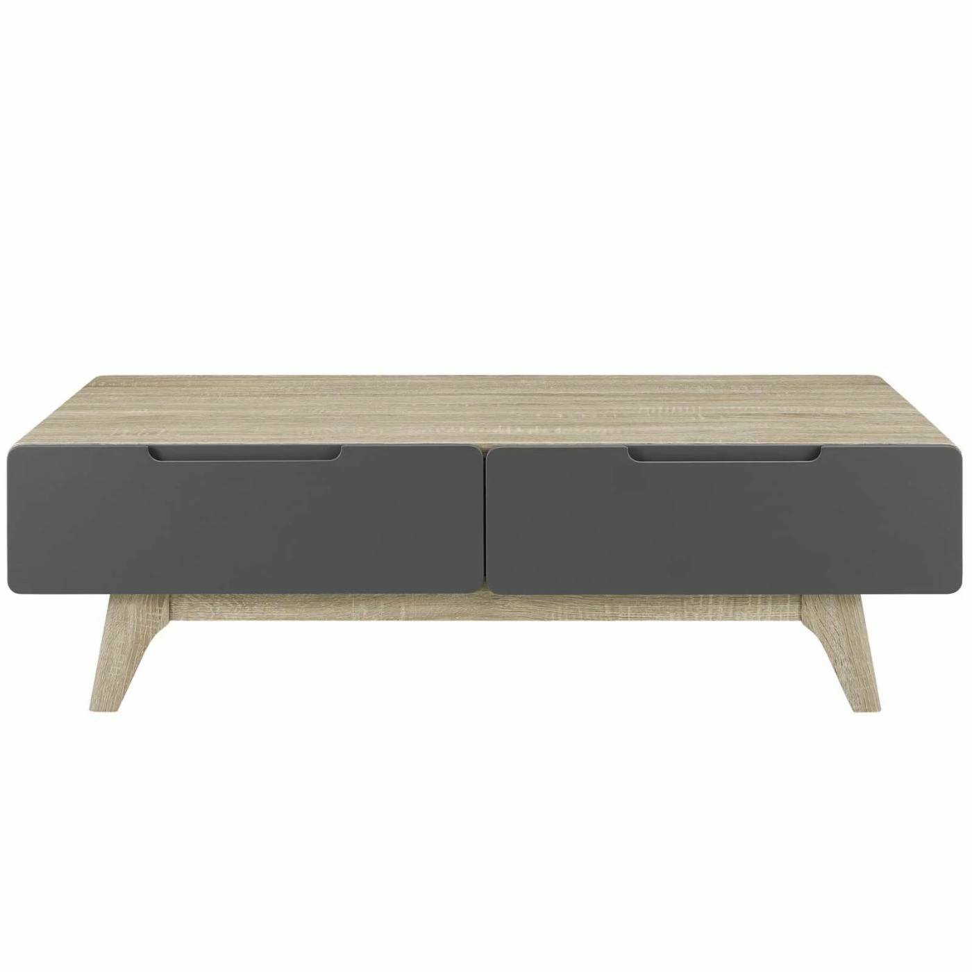 Clean lines and minimalist finishes enable the Modway Origin Coffee Table to be at home in most living rooms. Its sturdy engineered wood construction is topped in the available finish scheme of your choice, ensuring the ideal complement to your living room. Two full-extension drawers can conceal odds and ends while the spacious top can display your favorite reads and decorative accents. Tapered legs contribute to the mid-century modern appeal of this coffee table.