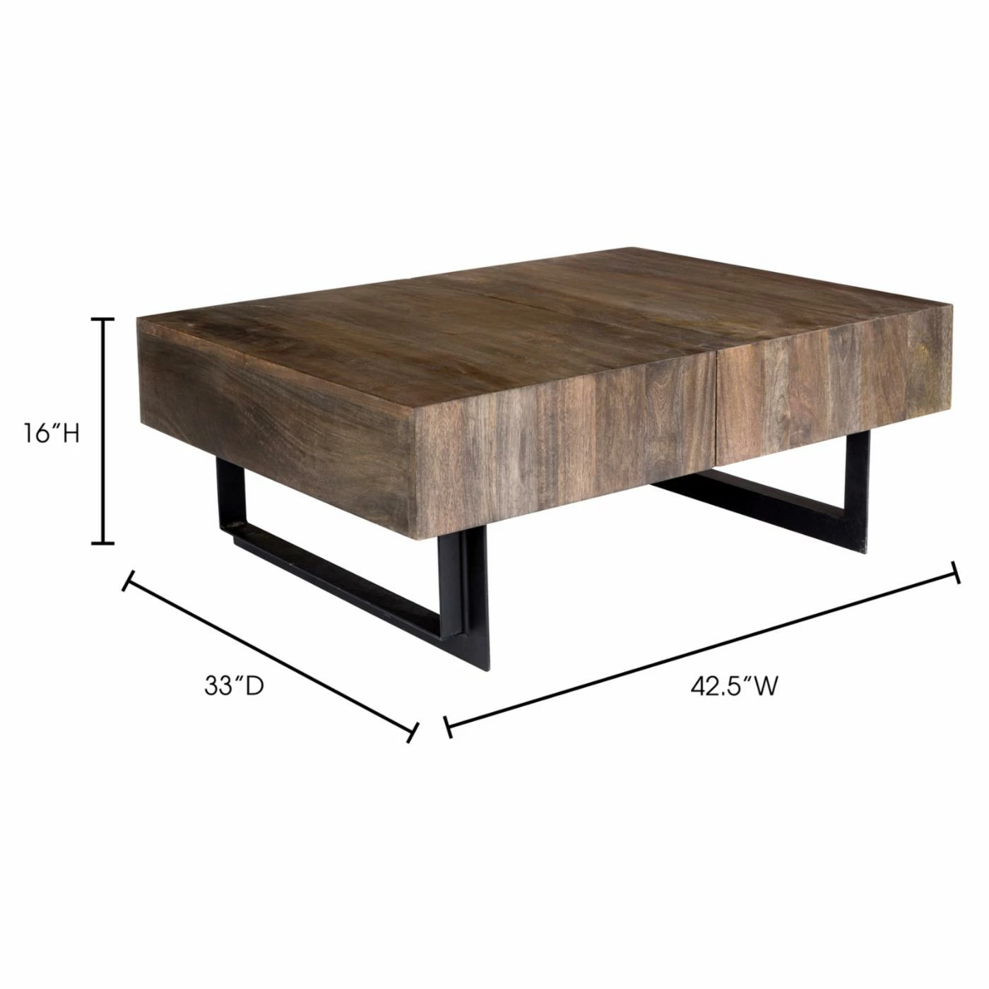 Beautiful and stunning, the Moes Home Collection TiburonΒ Storage Coffee TableΒ is a true statement piece. Its iron base supports a solid mango wood top with a rich, distressed finish which gives it a reclaimed look you’ll love. This piece beautifully suits your entertainment area or living room and houses reading materials, plants, and more. It opens to reveal an enclosed storage space. Elegant and sophisticated, you’ll love the way this gorgeous coffee table looks in your home.