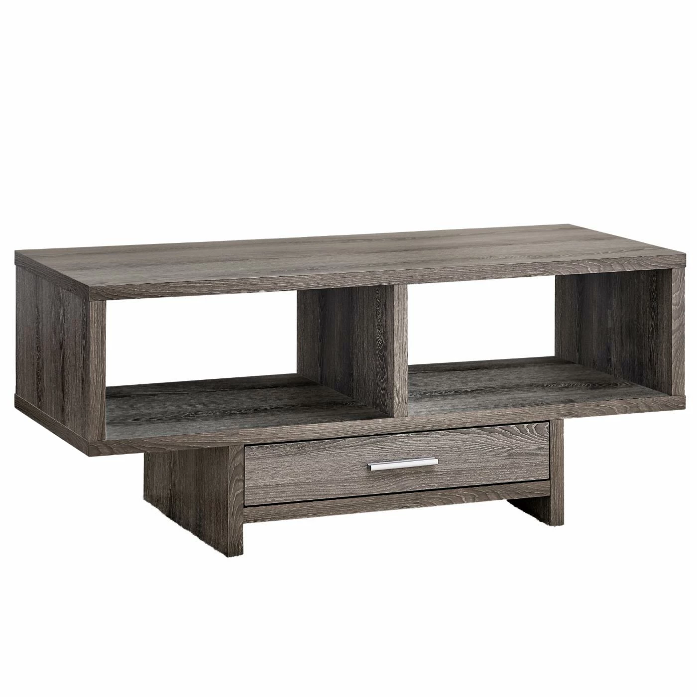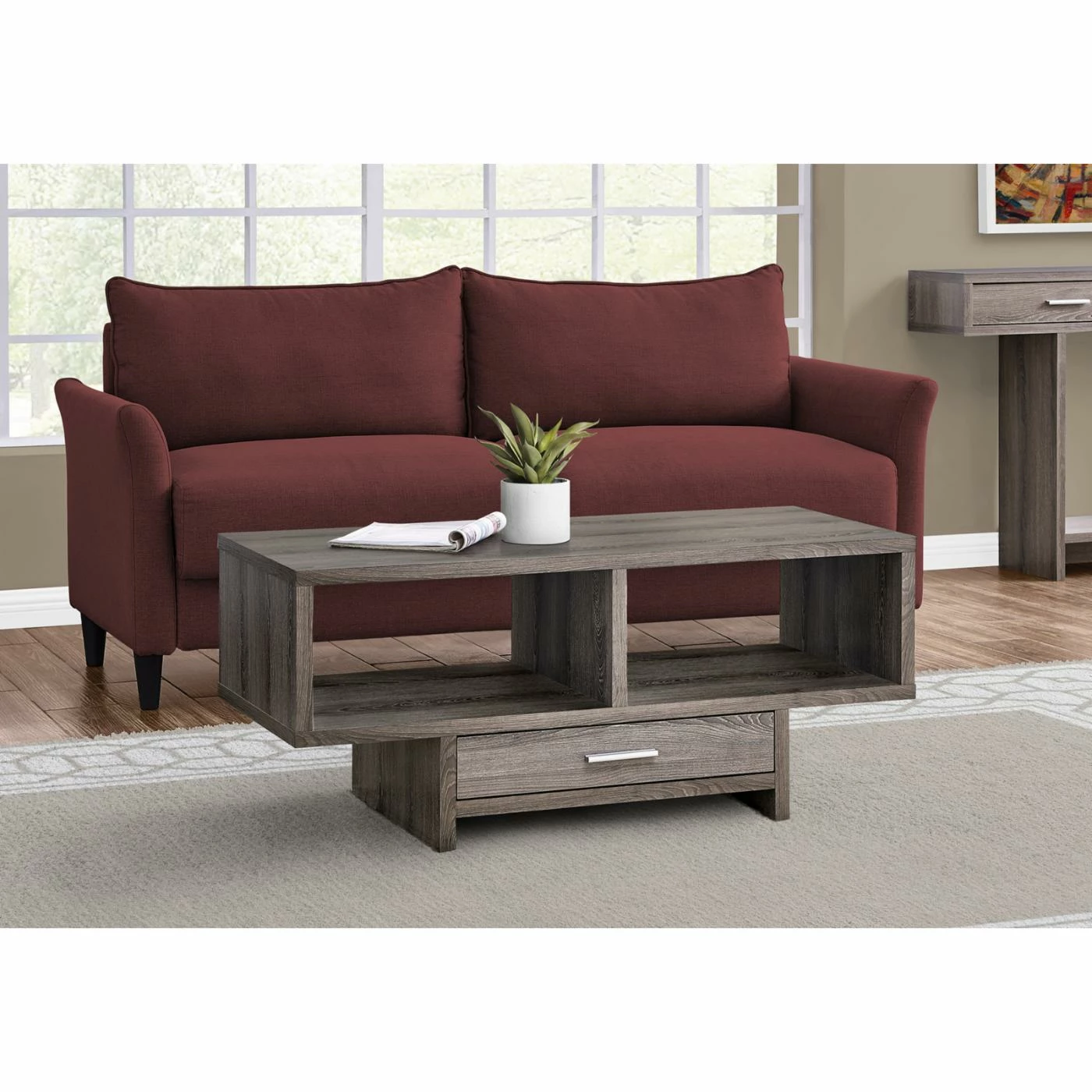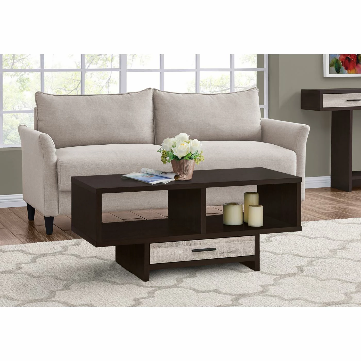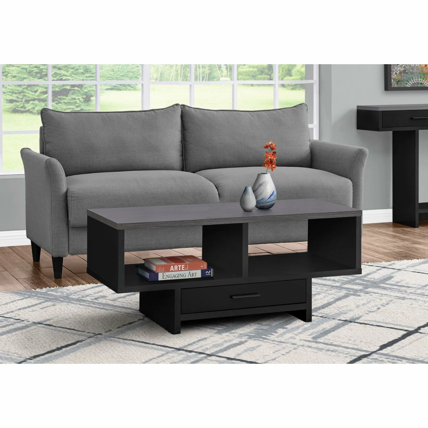 The unique, thick paneled Monarch Specialties Contemporary Storage Coffee Table will give your living or office space that extra presence. Available in choice of finishes, it includes a drawer on smooth metal glides and accented with a handle, keeping the clutter out of sight. The two open cubbies can be used for creative display or to store books and magazines within easy reach. The spacious and smooth table-top has ample place to set down food and drinks whether working or entertaining. Assembly is required.
