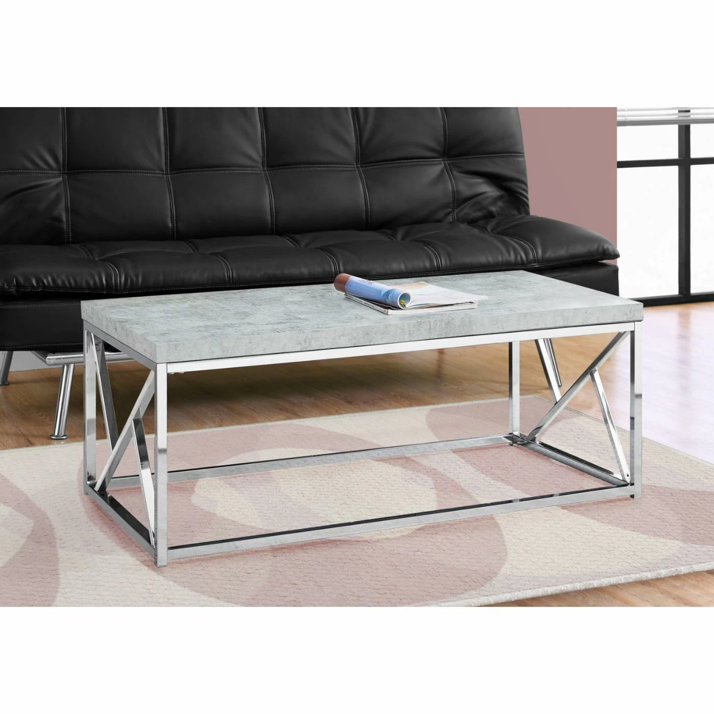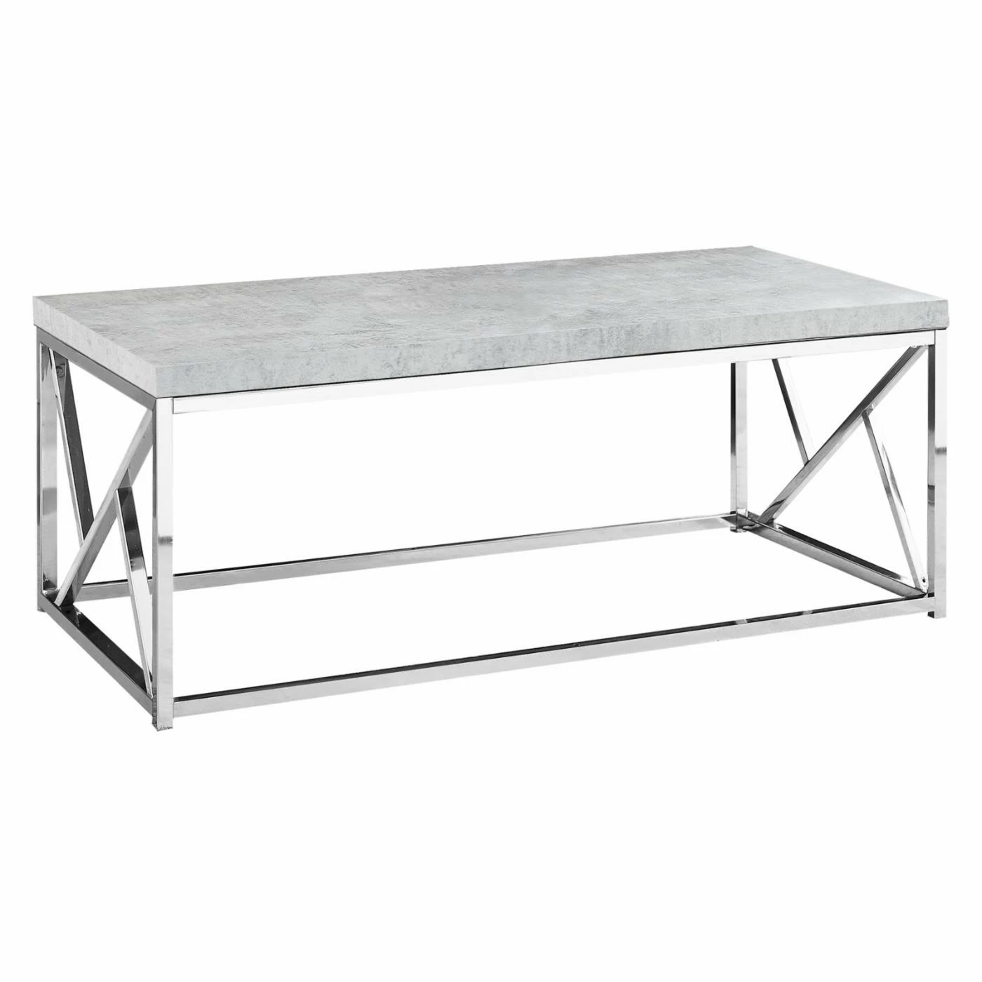 Chrome and concrete sounds like the title for a detective novel, but the only mystery here is why you don’t already have the Monarch Specialties Rectangular Coffee Table. This fashion-forward table combines the polish of chrome with the look of freshly poured concrete. The tabletop is made from a thick slab of engineered wood with a veneered exterior that gives it that poured-concrete appearance. The frame is made from square-tube steel with geometric accents on the side and a highly polished finish of bright chrome.