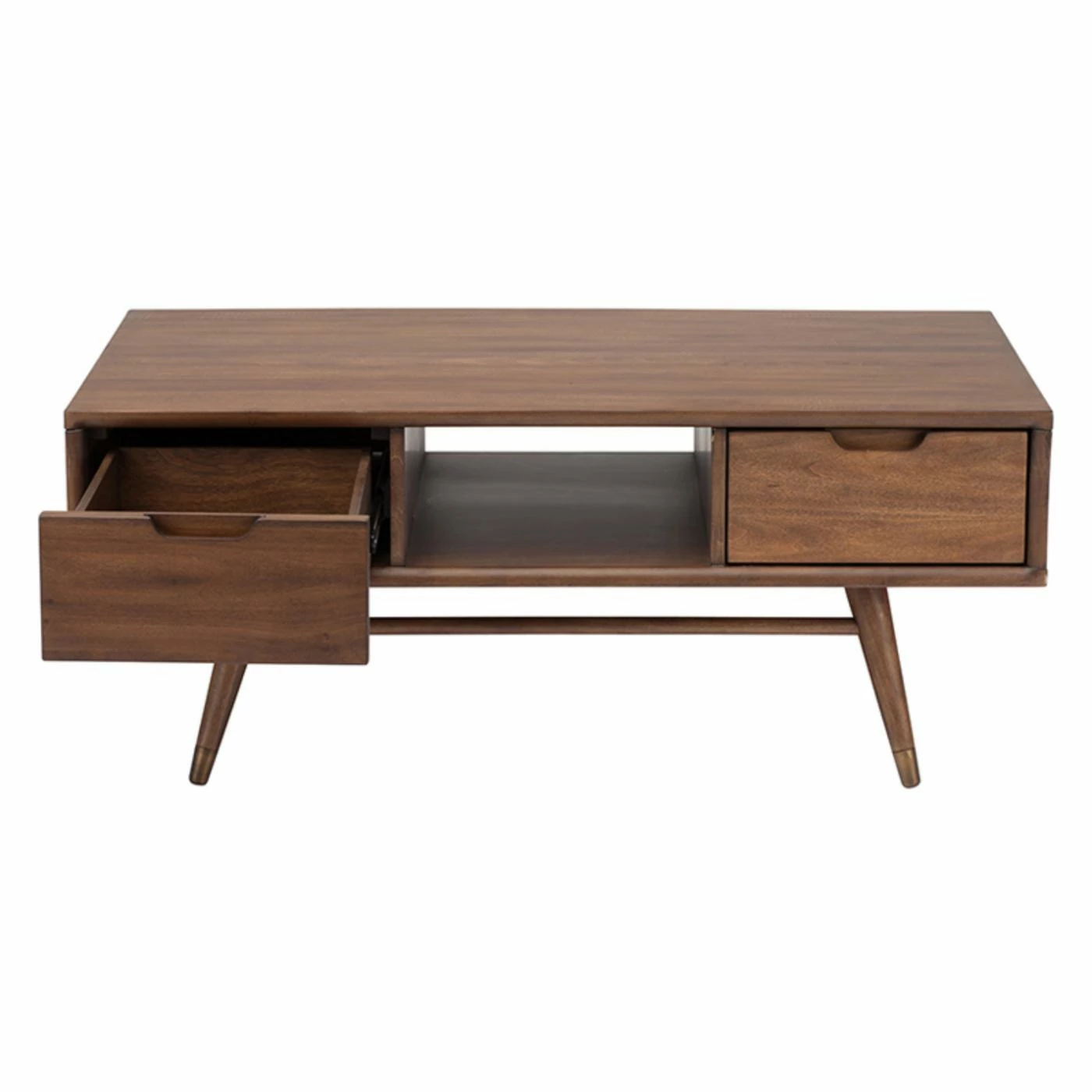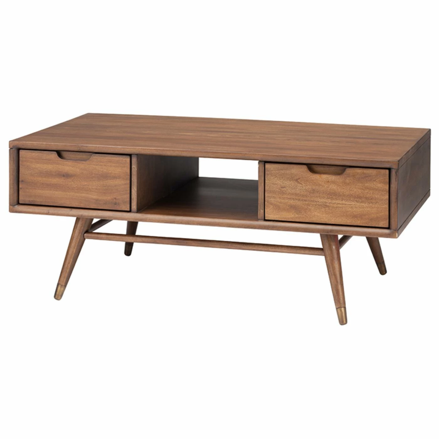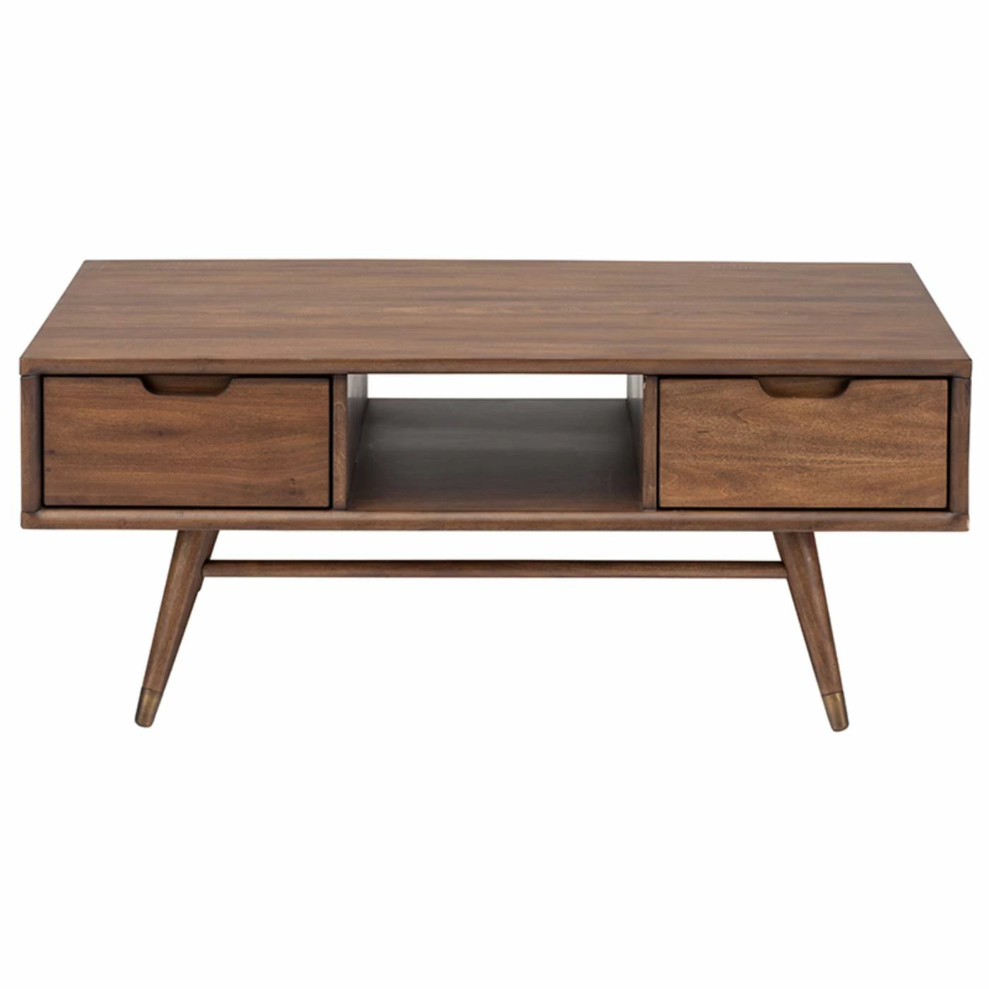 The modern Nuevo Jake Coffee Table goes beyond function to add mid-century artistic value to your room. This coffee table is built with American poplar and has a walnut brown finish. It features two drawers with open space in between, providing the perfect place to store media accessories.