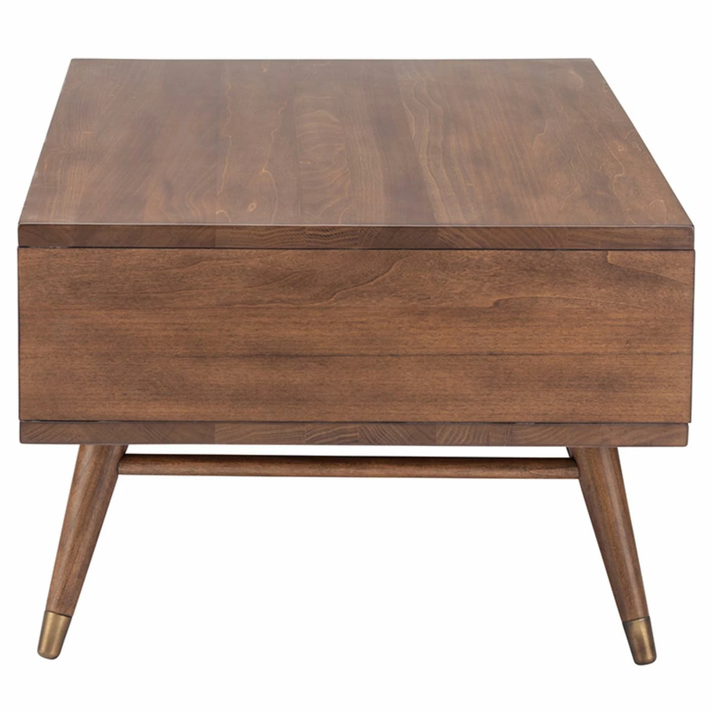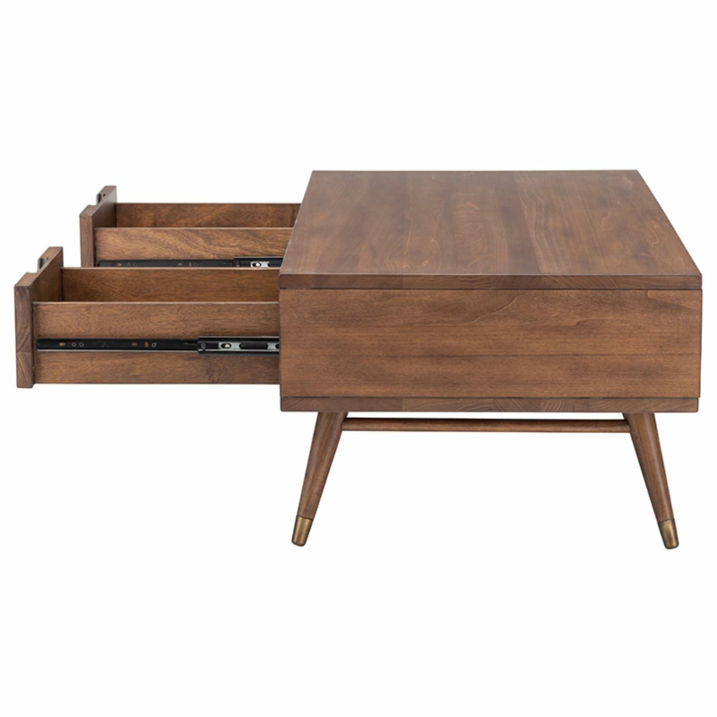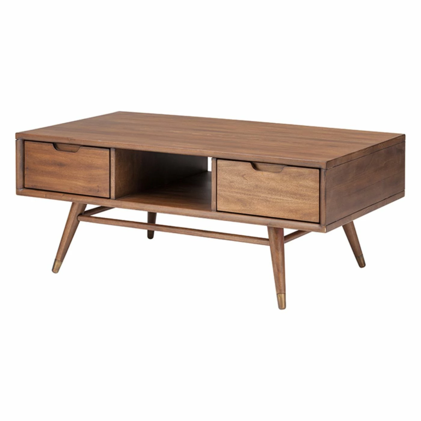 The modern Nuevo Jake Coffee Table goes beyond function to add mid-century artistic value to your room. This coffee table is built with American poplar and has a walnut brown finish. It features two drawers with open space in between, providing the perfect place to store media accessories.