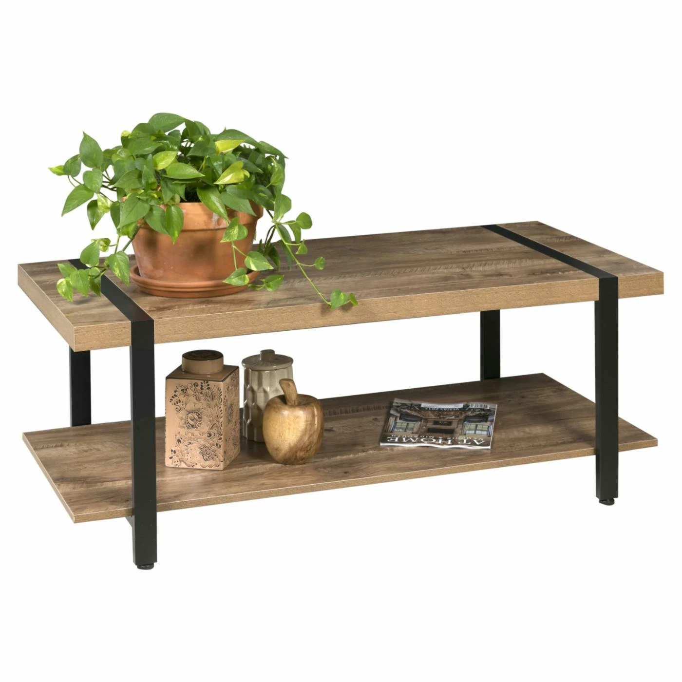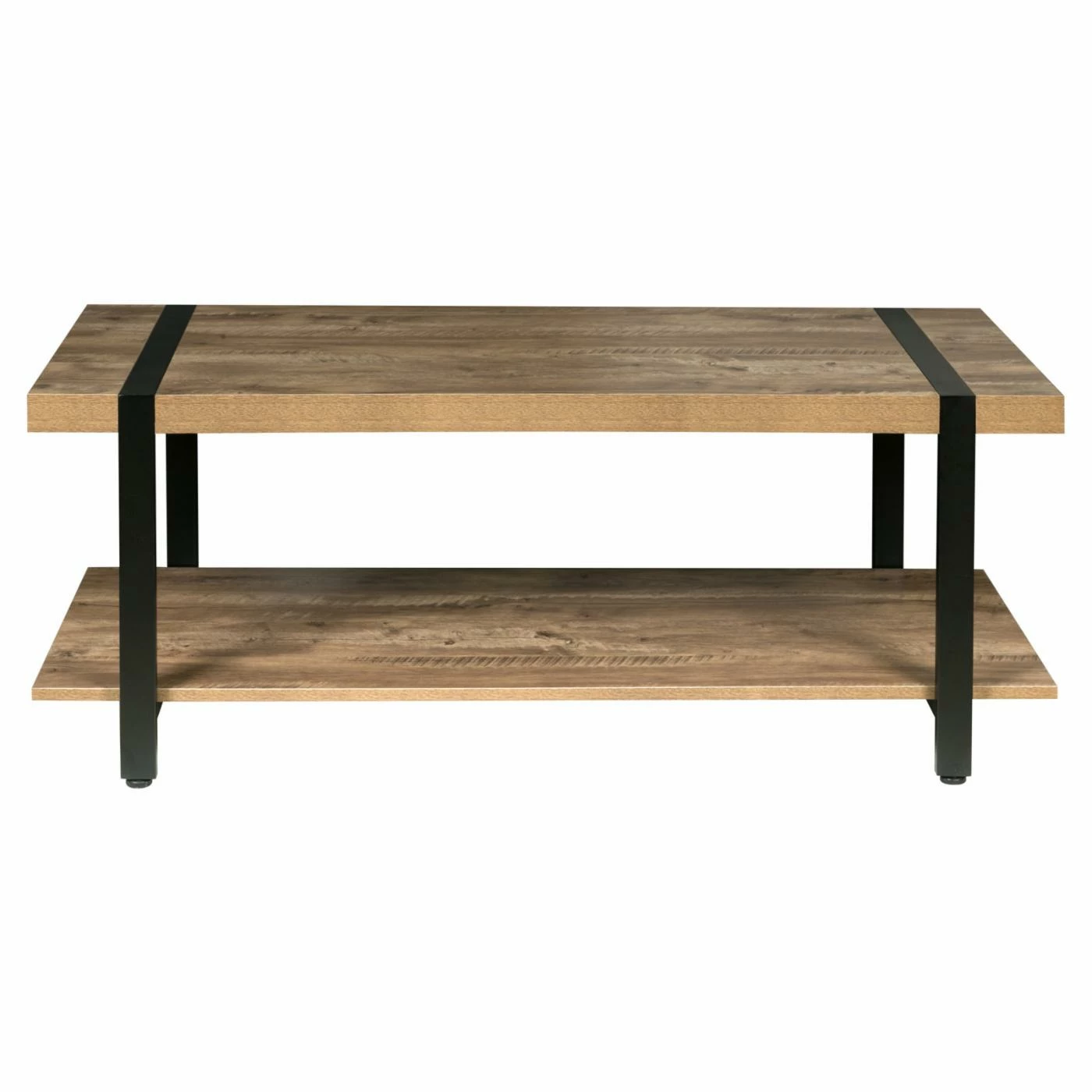 The sleek, minimalist design of the OneSpace Bourbon Foundry Coffee Table complements any home. This coffee table features a versatile natural oak finish accented by a black steel frame. The ample tabletop is the perfect spot to set drinks or a snack. The open bottom shelf delivers convenient storage.