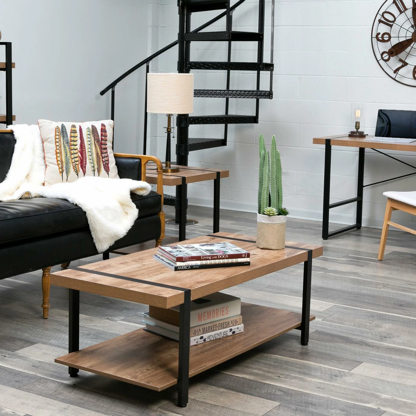 - Oak finish with black steel accents