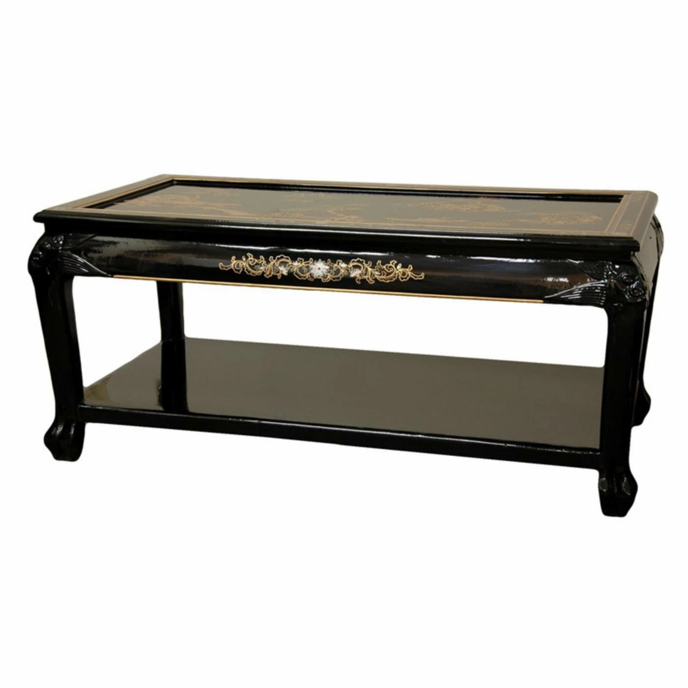 The Oriental Furniture Coffee Table with Shelf will make a stunning addition to your living room. It’s hand-crafted from sturdy Elm wood by an artisans’ collective in the Guangdong province of China. It’s exquisitely designed with a carved lion’s face at each corner and stylish claw feet. The tabletop features a traditional Asian landscape scene, and since it’s hand-painted, each table is unique. This coffee table is finished with a high-luster lacquer that enhances it’s elegant look, and it has a shelf where you can store magazines, movies, remote controls, and other items.