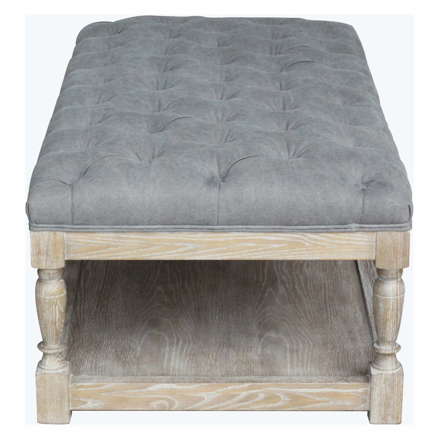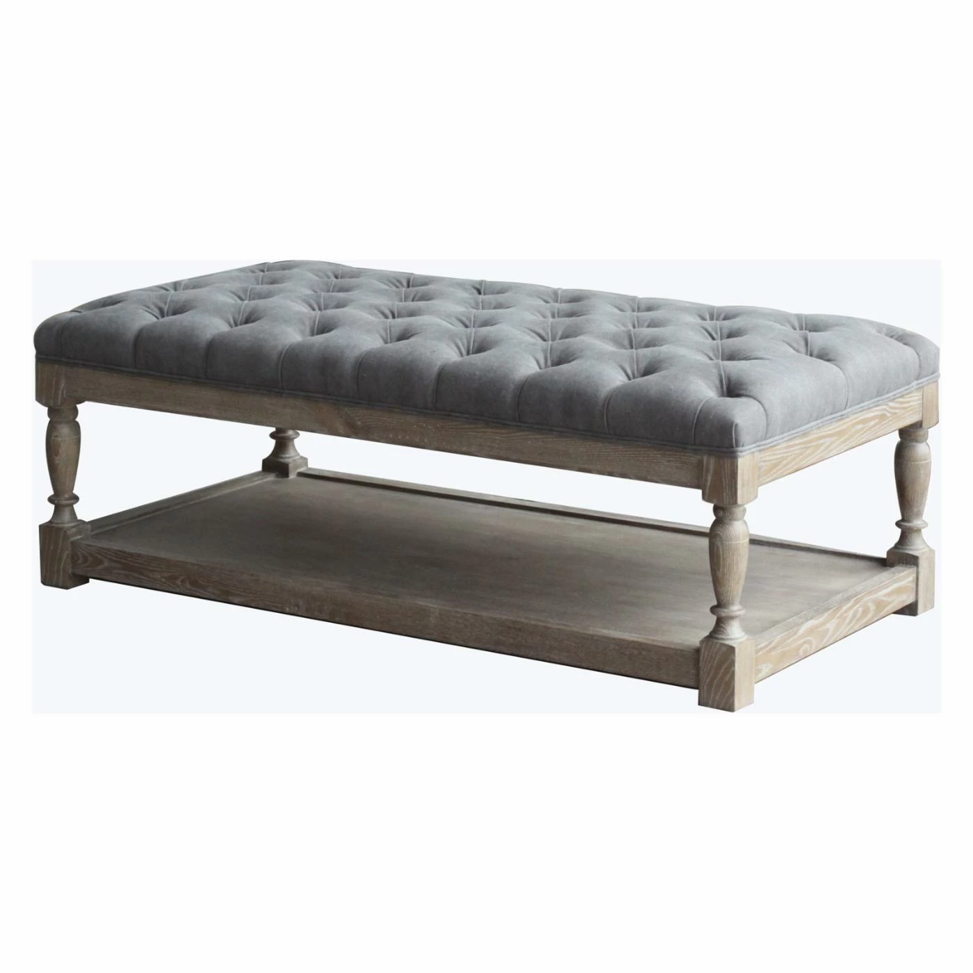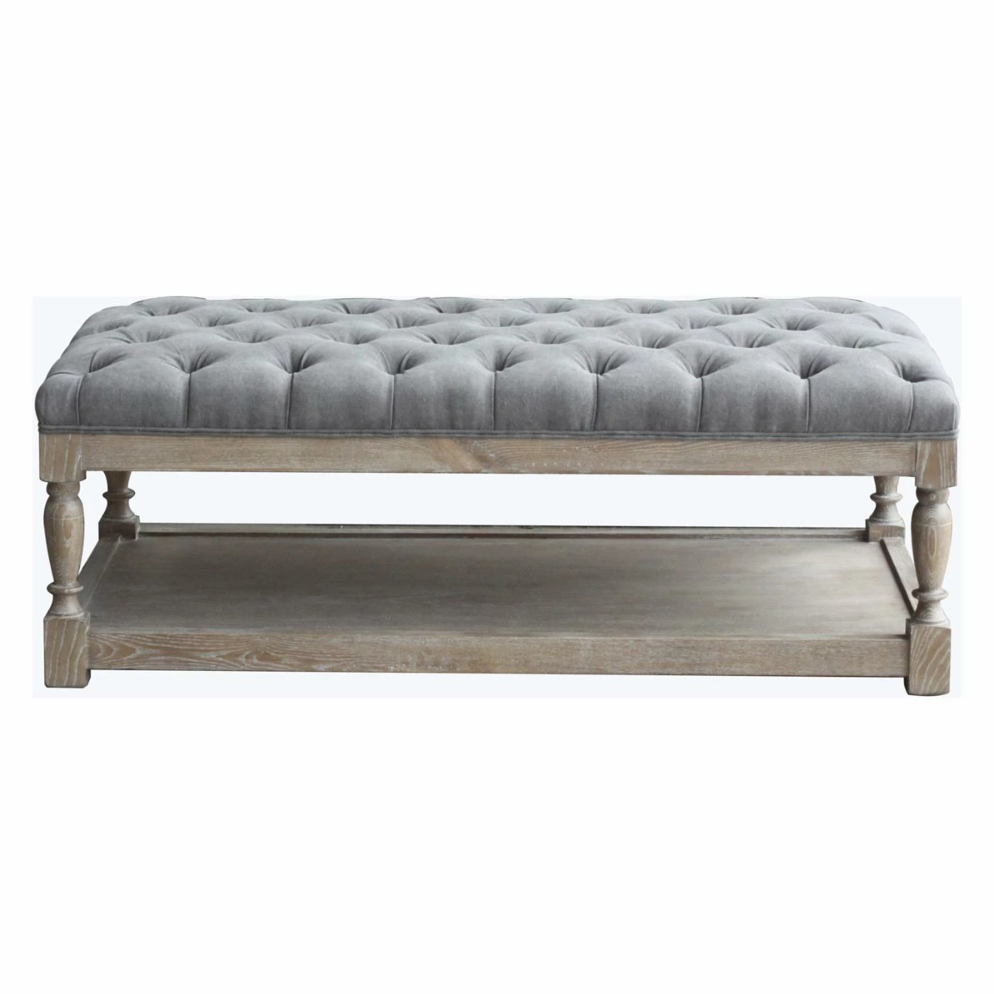 Inspired by classic European design, the Pangea Home Athena Rectangular Coffee Table adds beauty and elegance to your living room. Its upholstered top, which comes in your choice available colors, is soft and luxurious while the button tufting elevates its design. Crafted from solid wood for strength and durability, with a whitewashed, light brown finish, this piece blends seamlessly with most color schemes. Use the bottom shelf for books and magazines or add a couple of baskets for added storage.