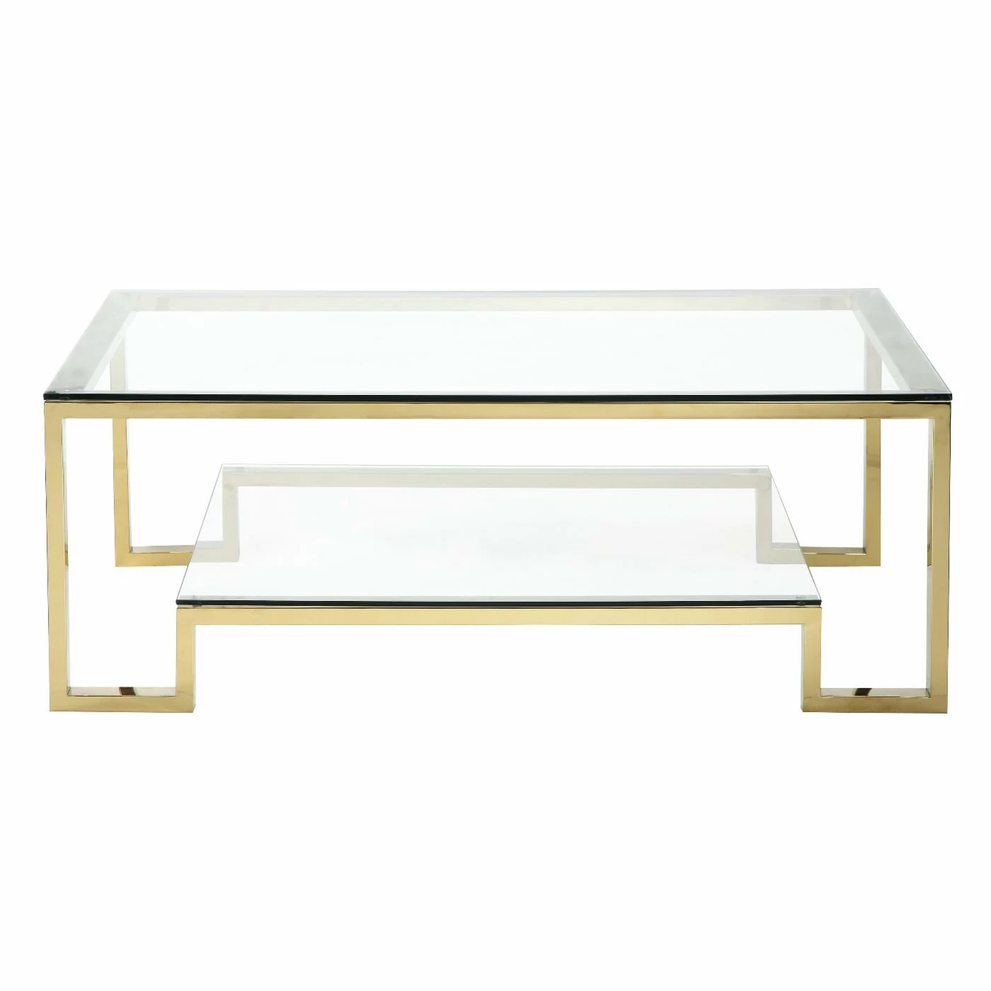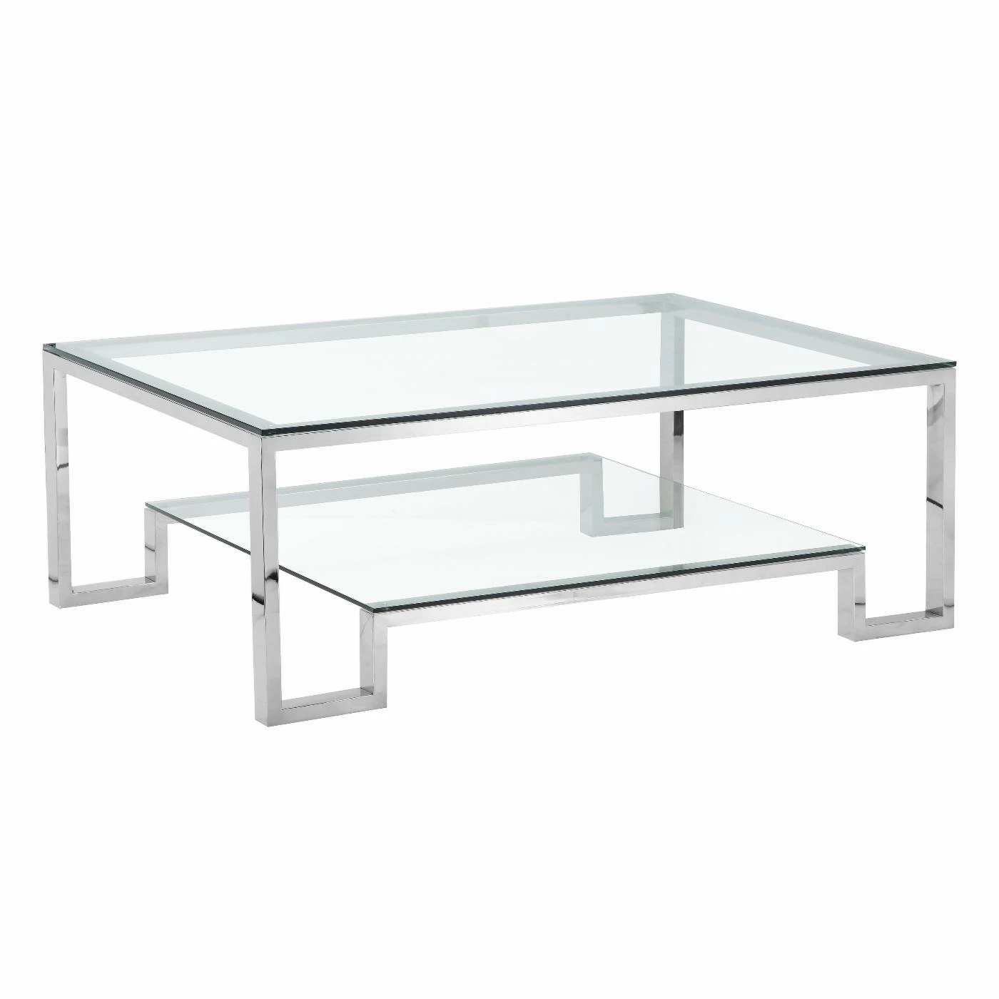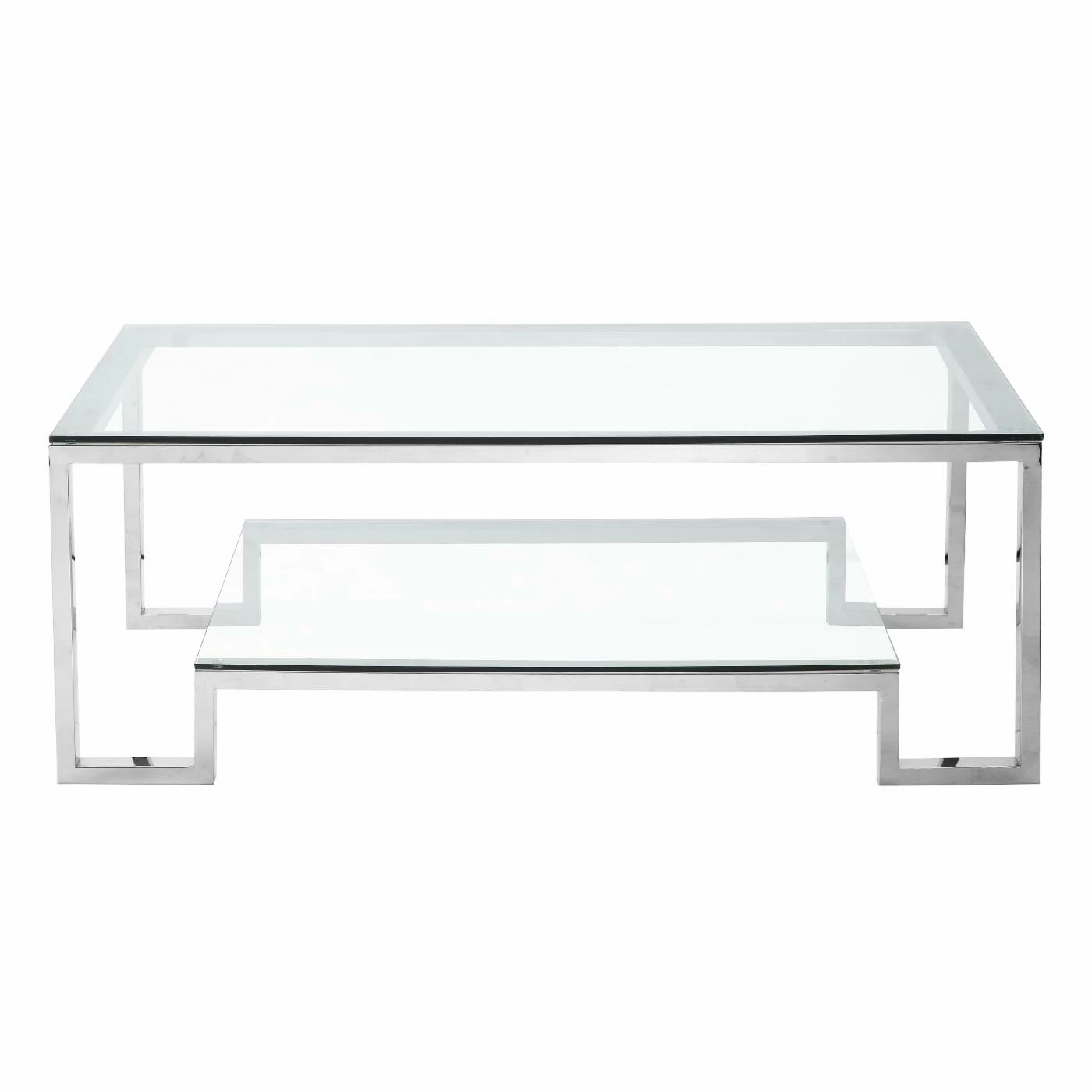 Geometric and polished to a high shine, this Pangea Home Laurence Coffee Table elevates your modern interior design to the next level. This shimmering coffee table boasts a clear, tempered glass top and lower shelf. It comes in your choice of polished finish option.