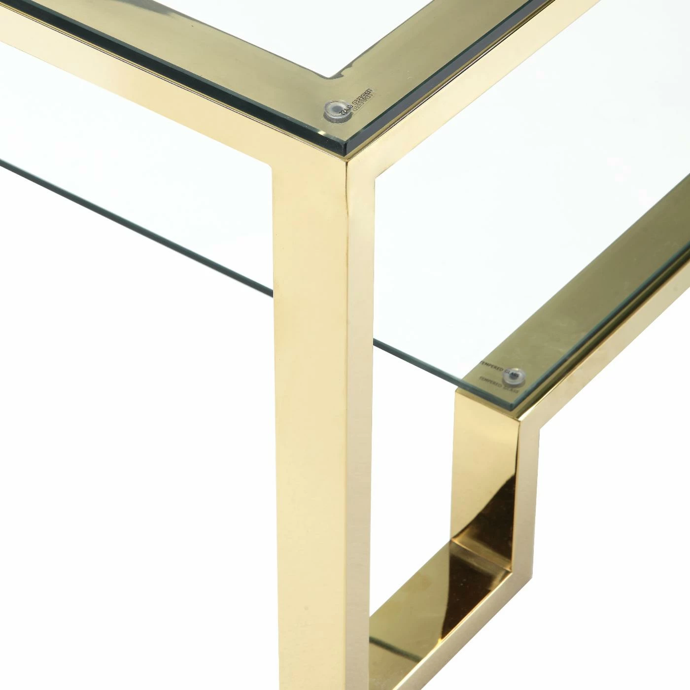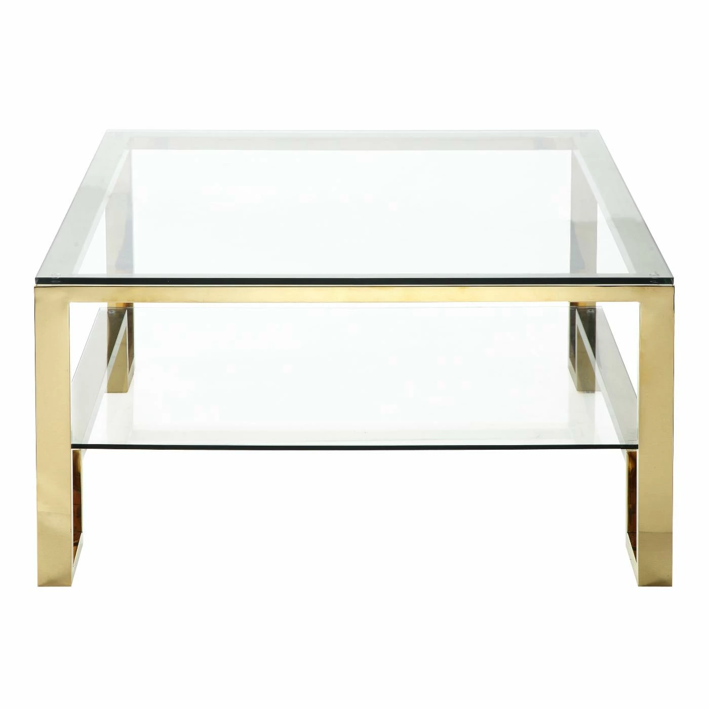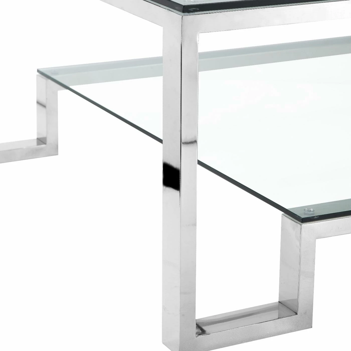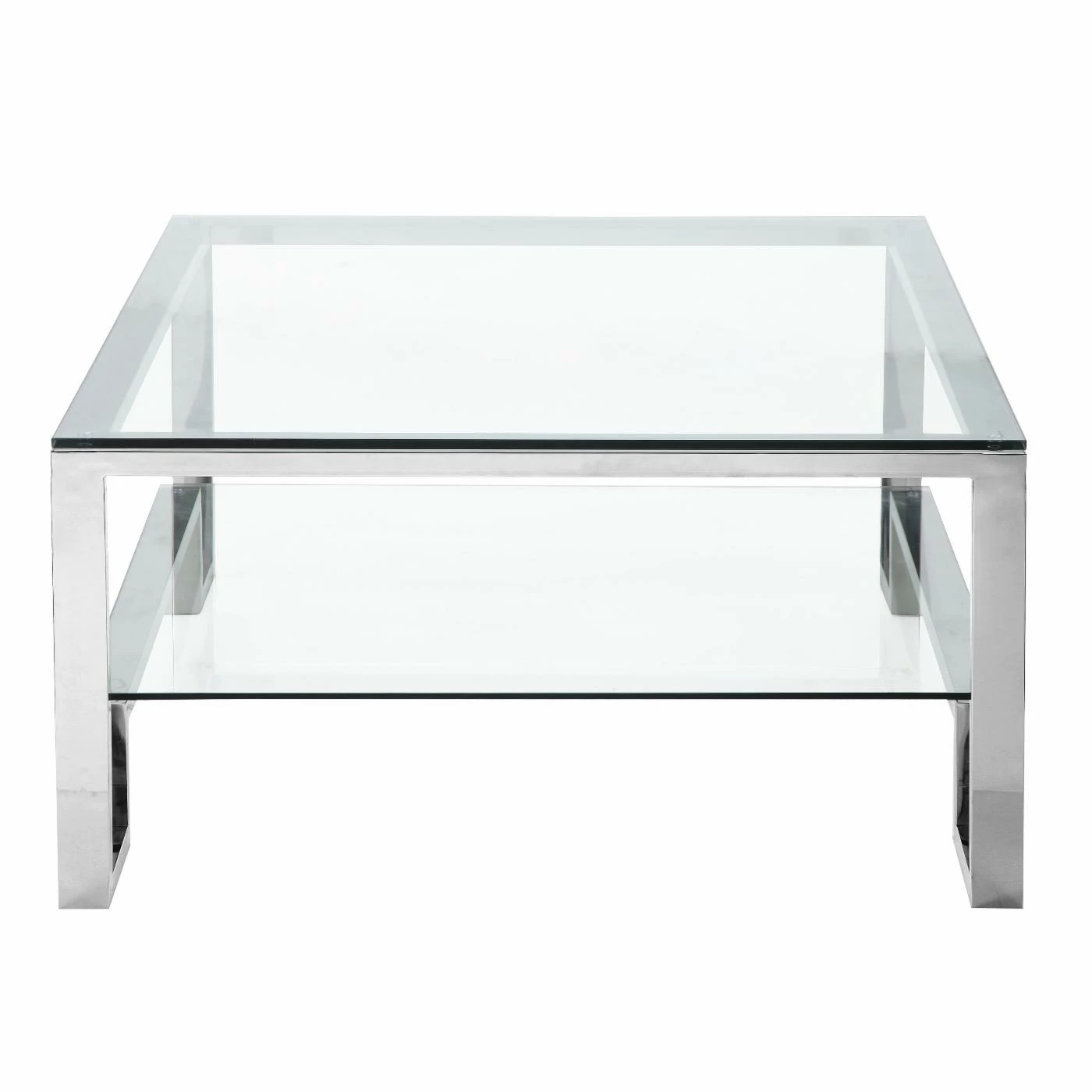 Geometric and polished to a high shine, this Pangea Home Laurence Coffee Table elevates your modern interior design to the next level. This shimmering coffee table boasts a clear, tempered glass top and lower shelf. It comes in your choice of polished finish option.