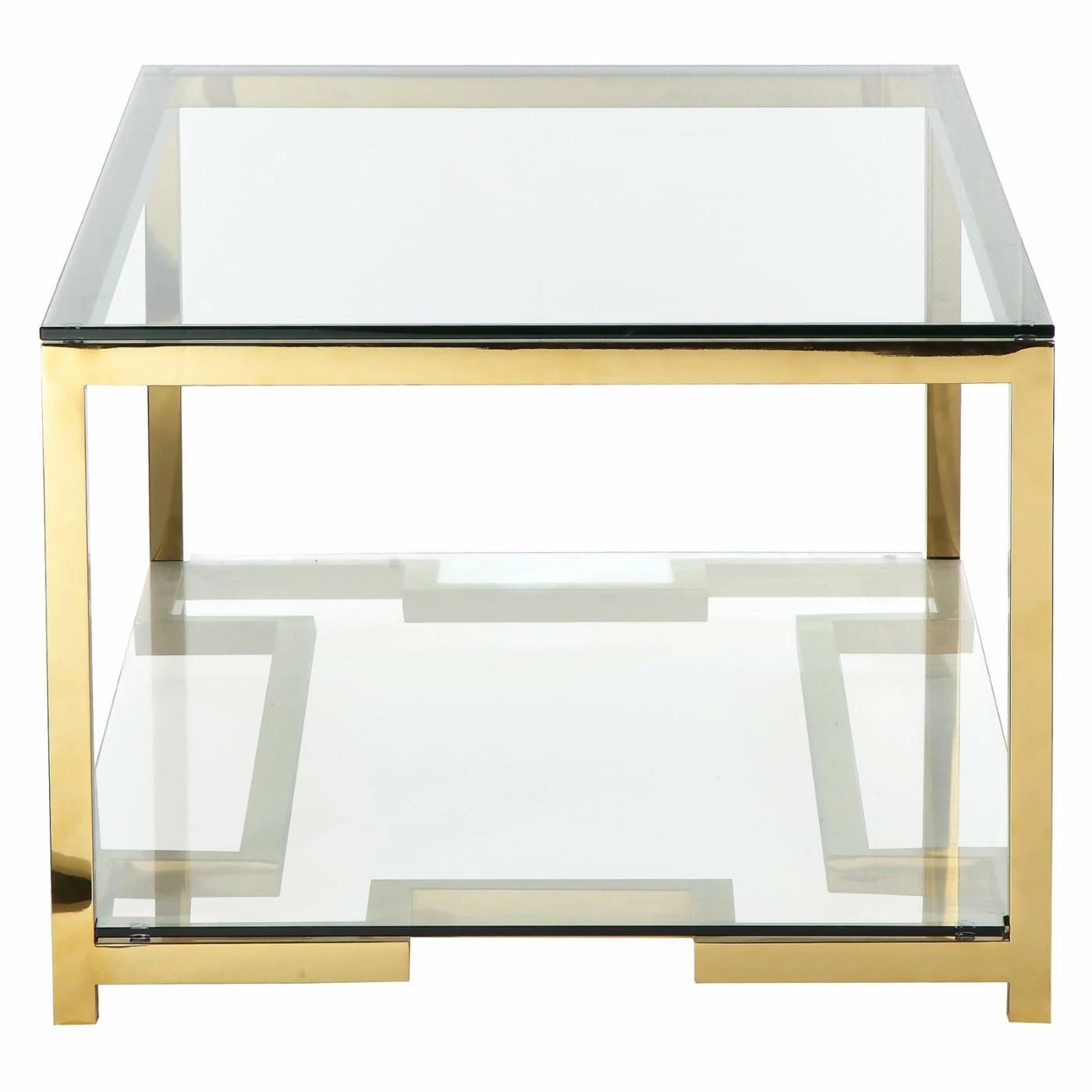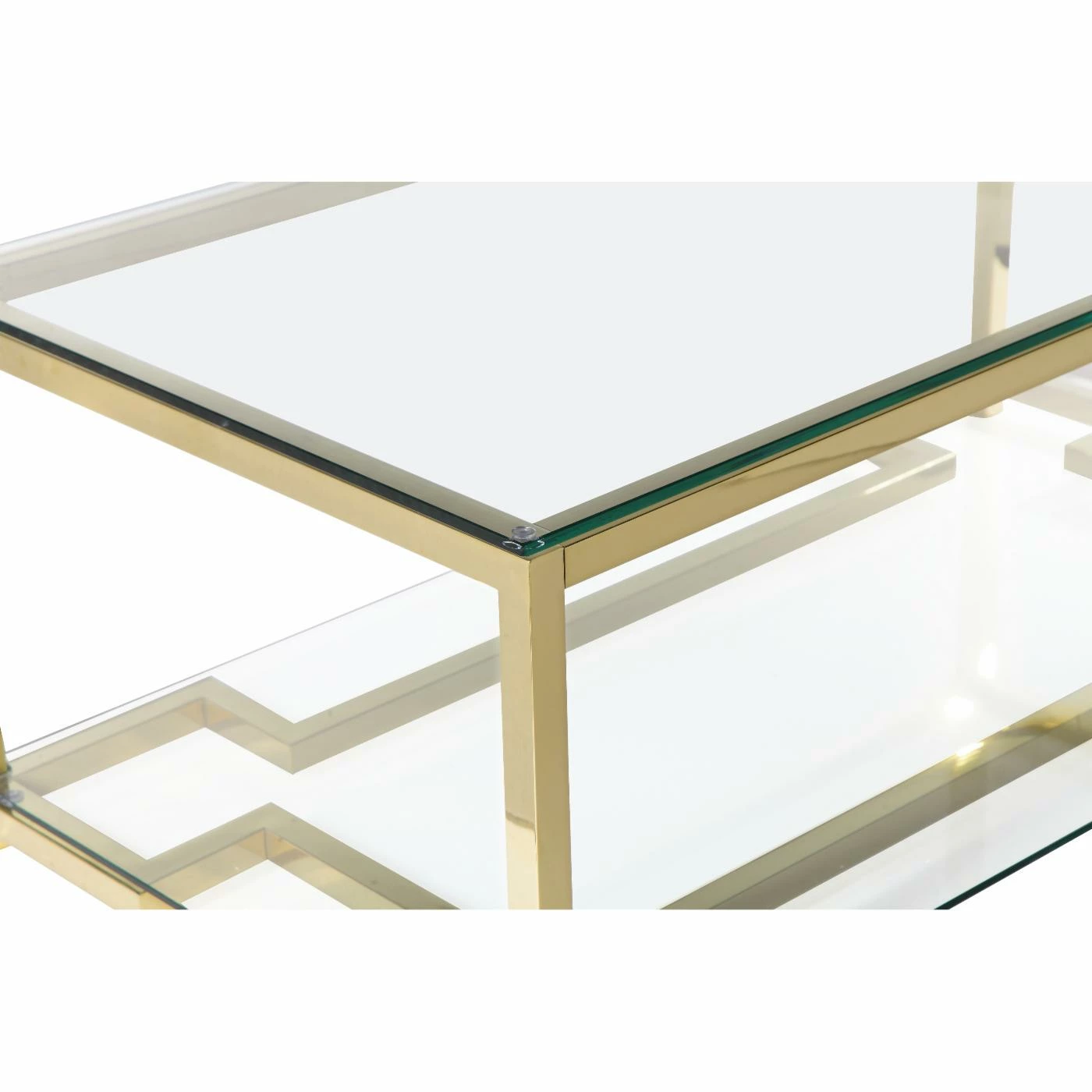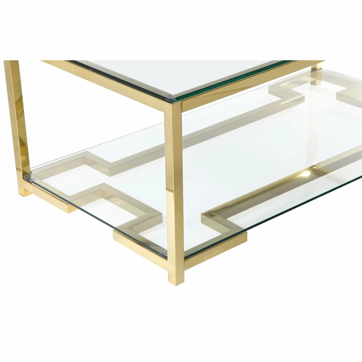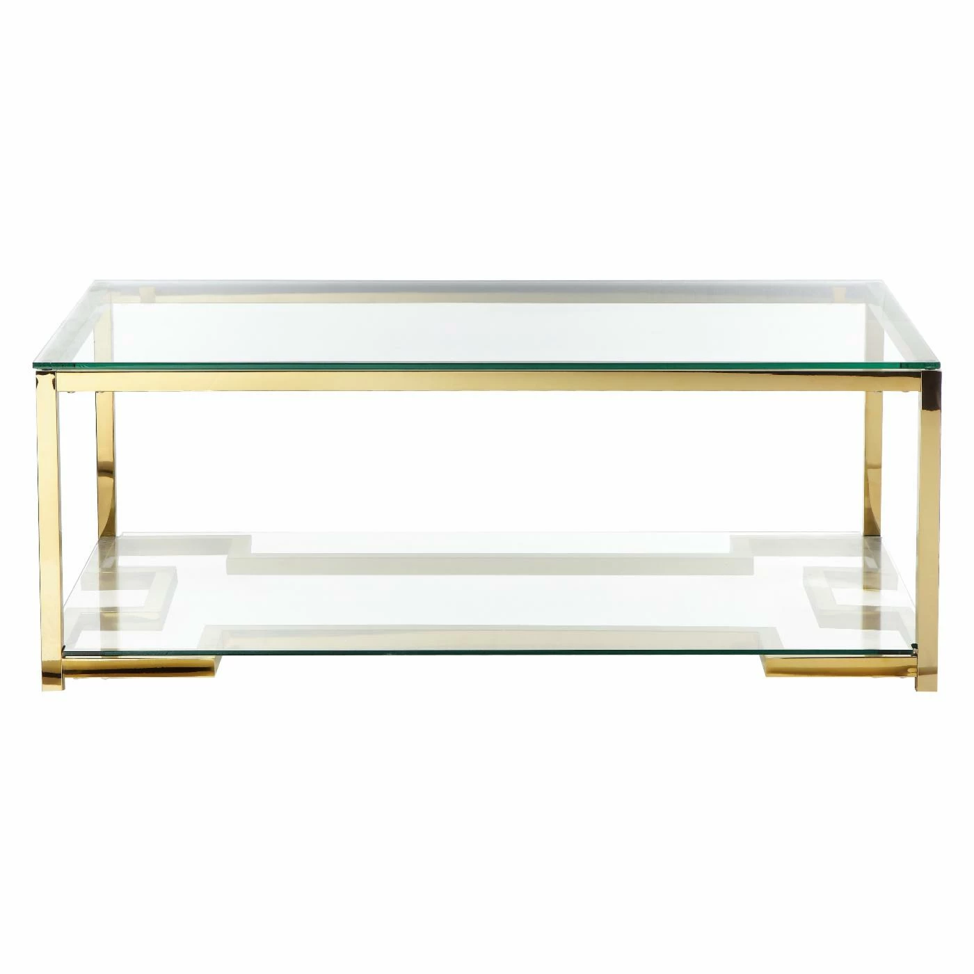Contemporary design elements highlight the clean lines and simple aesthetics of the Pangea Home Nina Coffee Table, making it an ideal choice for a wide variety of living room settings. Constructed of polished gold stainless steel and glass for years of use, this coffee table is a true celebration of form and function. The glass top is matched by a bottom shelf, which is perfect for keeping your magazines and newspapers handy.