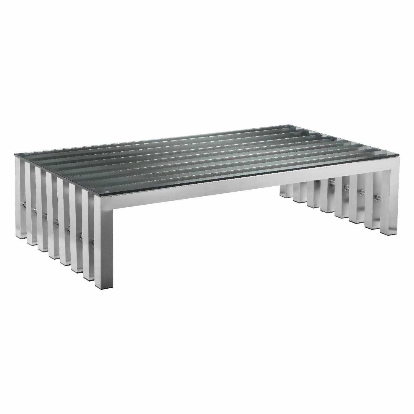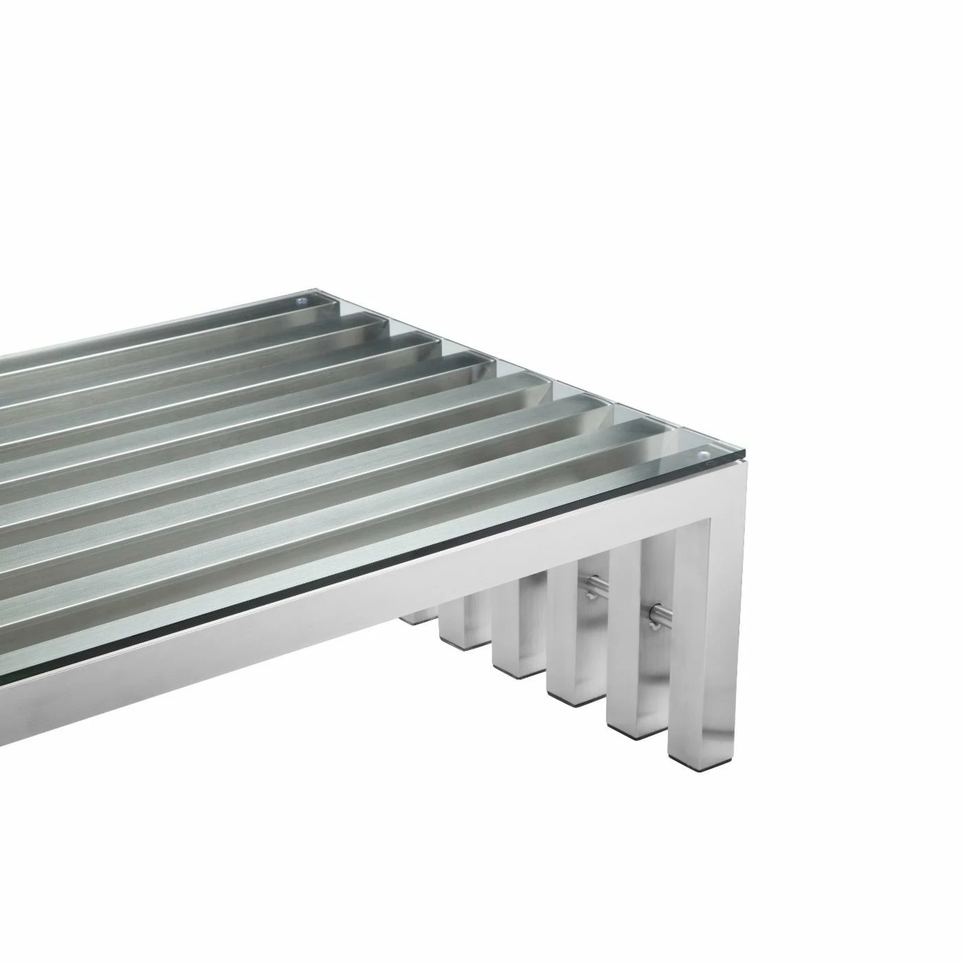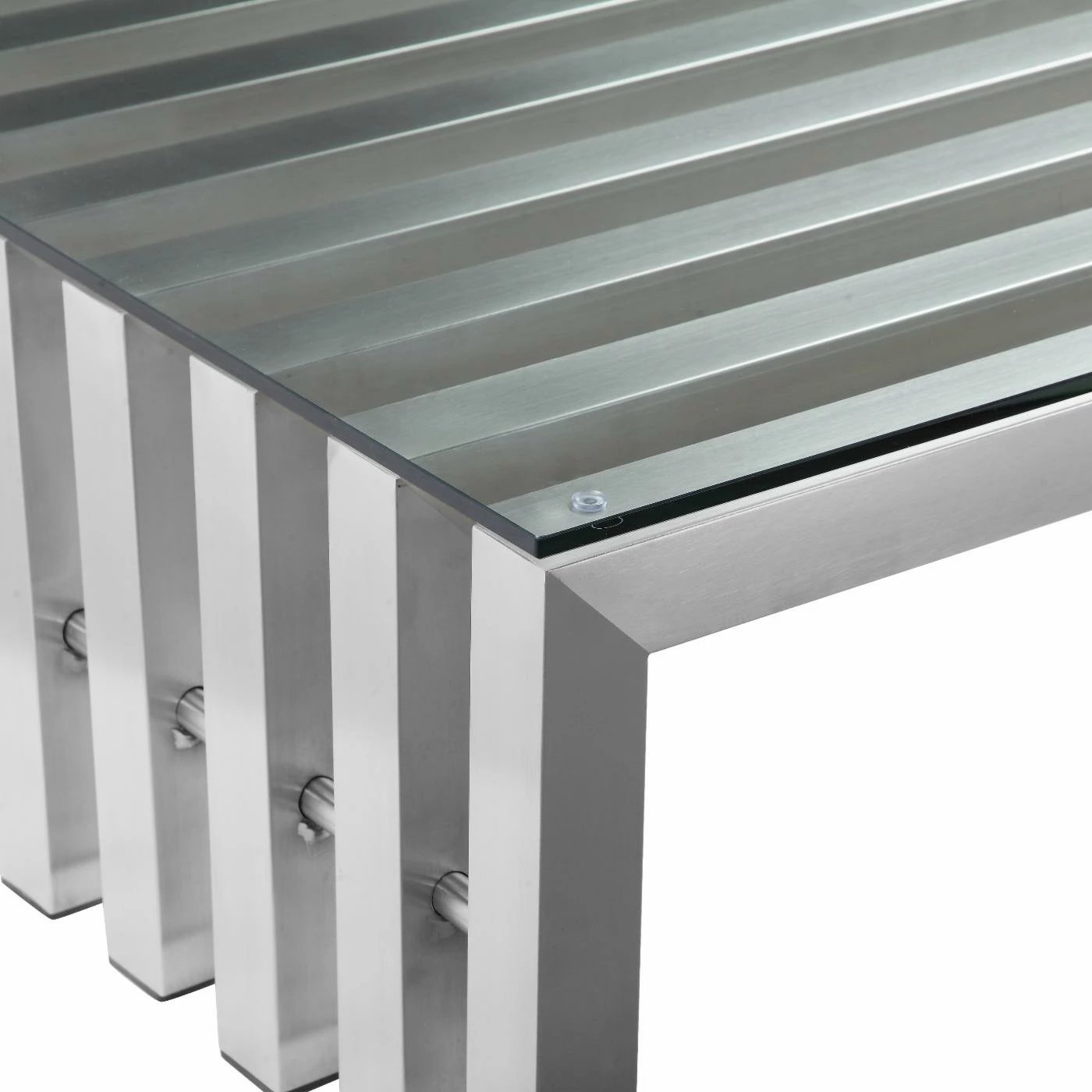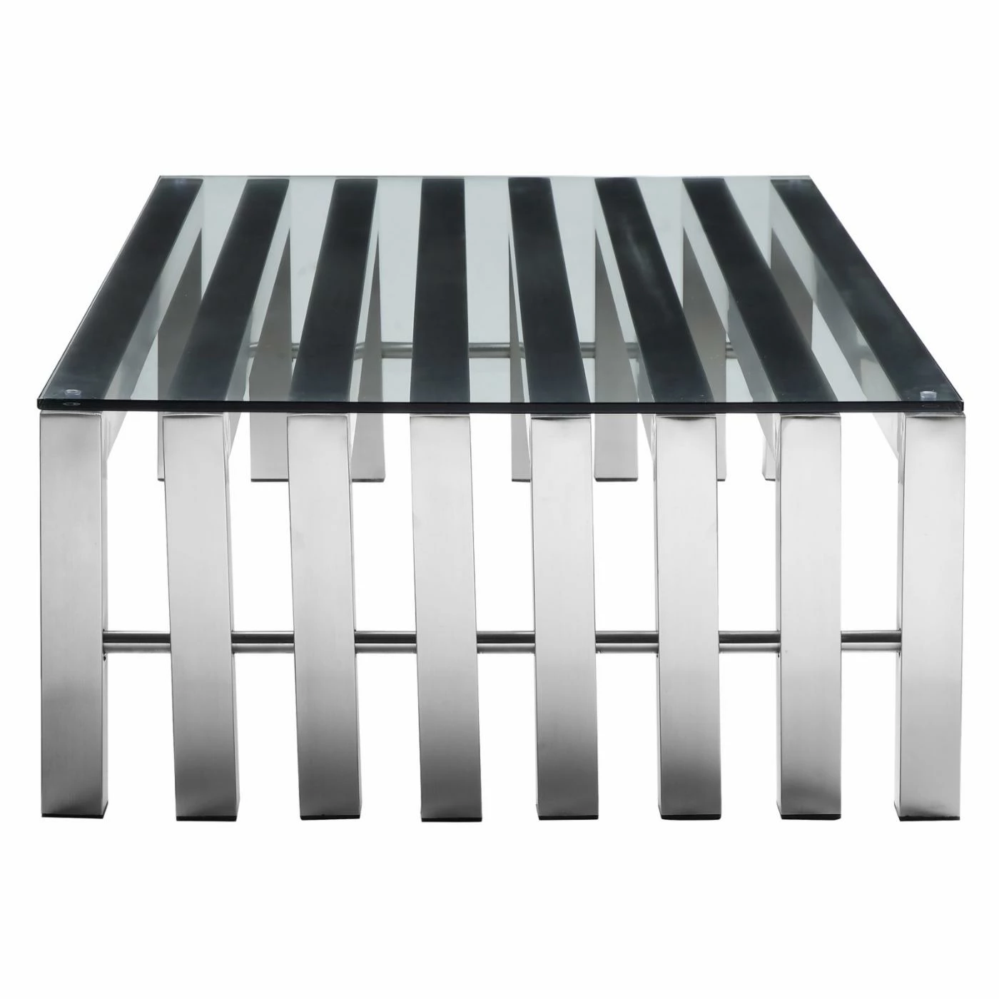 A smooth lozenge of tempered glass tops the Pangea Home Vlad Coffee Table Rectangle Brushed Metal, a refreshingly sleek coffee table for the modern home. Steel slats are evenly spaced for a rhythmic, harmonious feel. Add a few books or a ravishing centerpiece and take your living room to the next level.