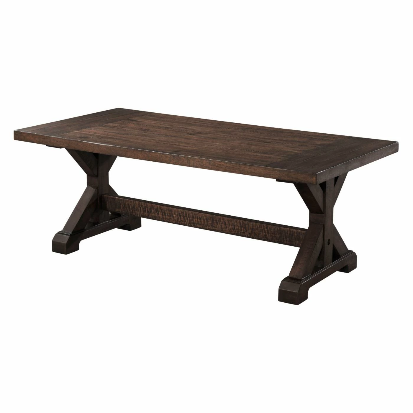 This Picket House Furnishings Flynn Trestle Coffee Table is a transitional gem that will bring function and style to your living room. This coffee table is crafted of rubberwood, acacia veneers, and engineered wood. It rests on an elegant trestle base and is swathed in a rich walnut finish.
