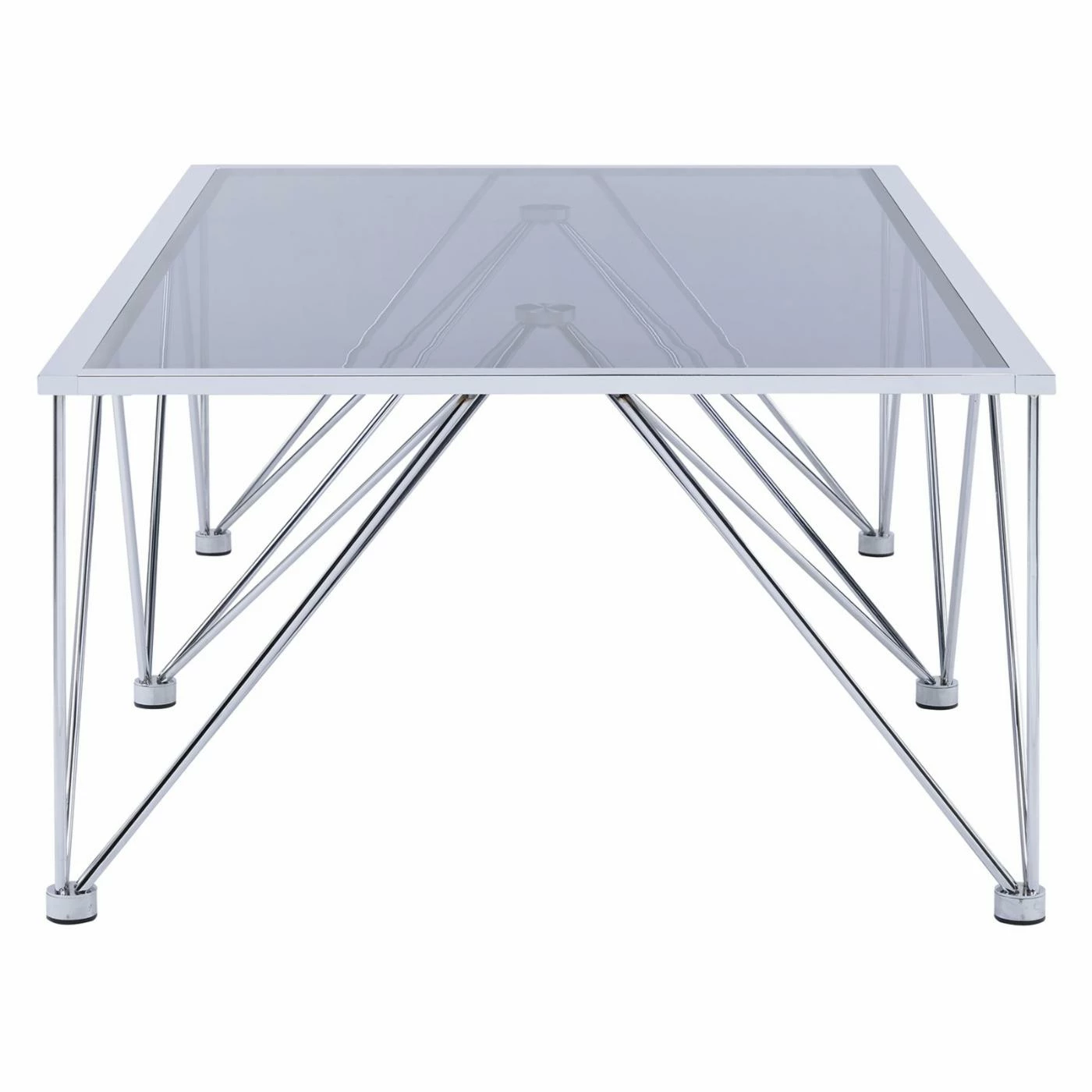 Glass and steel give the Picket House Furnishings Macie Rectangle Coffee Table a sleek, modern aesthetic. This rectangular coffee table features a gray tempered glass top to create a feeling of more light and space. It stands on angular chromed metal legs that add architectural intrigue.