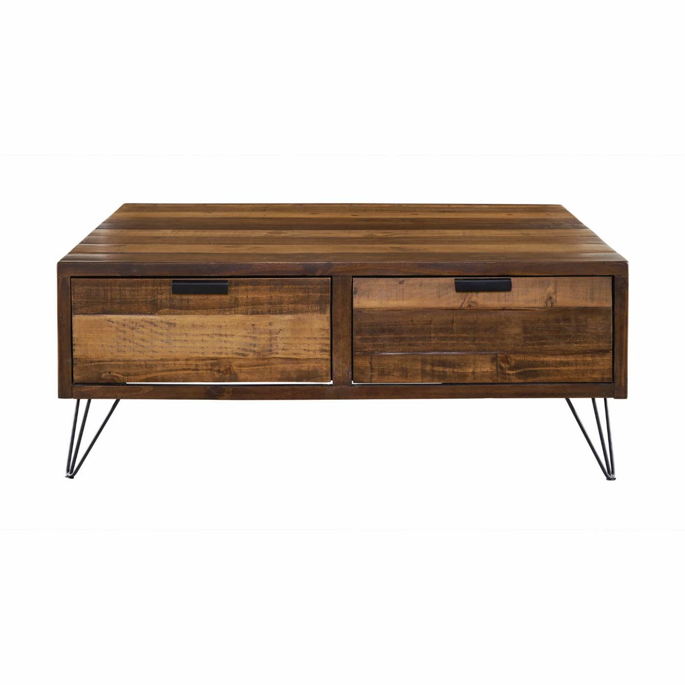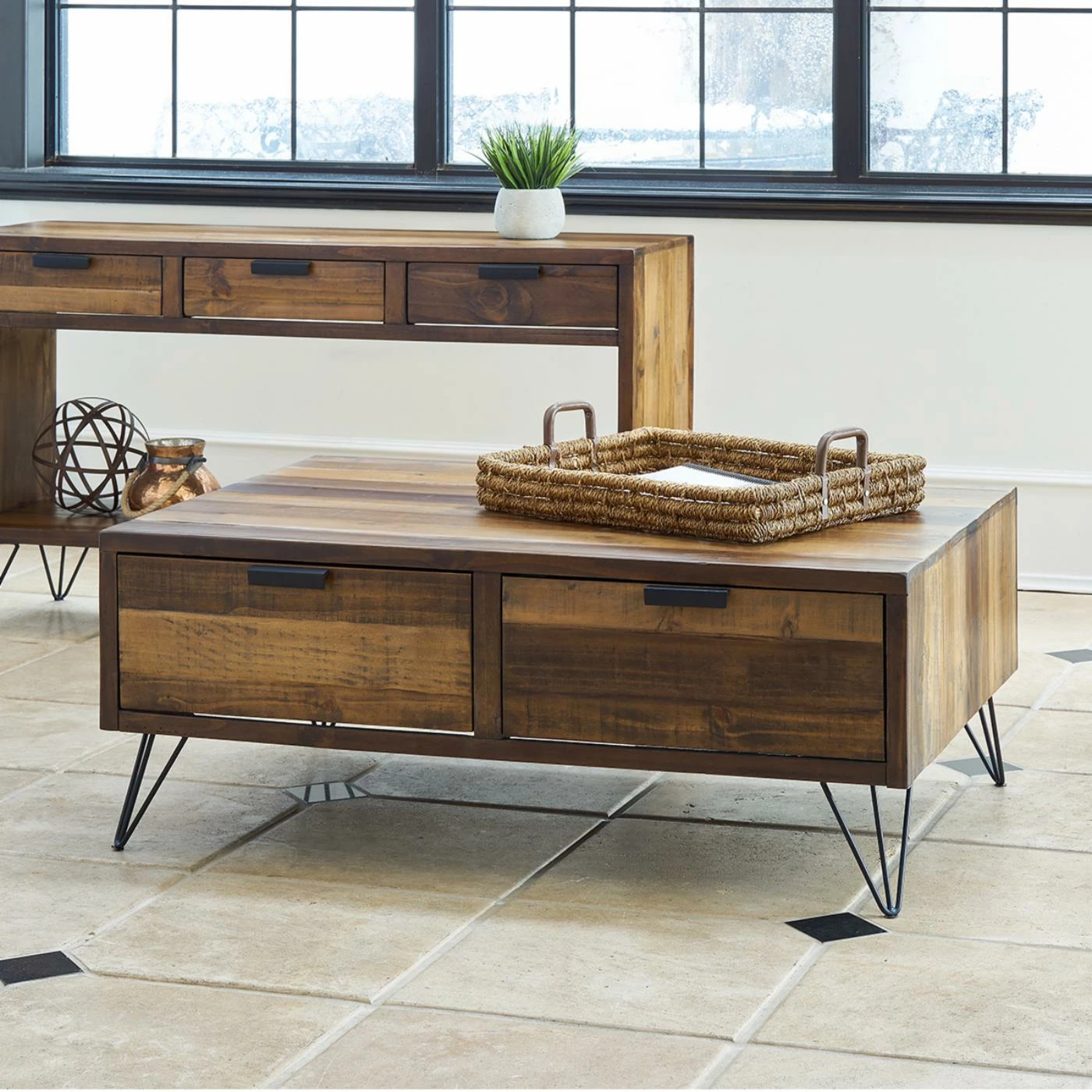 The Picket House Furnishings Tyler Rectangular Coffee Table will be the focal point of your living room. This piece is beautifully constructed with solid Brazilian pine with distinctive characteristics. This coffee table is a unique piece of furniture and no two pieces are the exact same. There are color and grain variation within each piece of wood. The cracks and dents featured are not blemishes but rather beauty marks which enhance the appearance. Dark metal drawer pulls and legs accent this piece for a rustic-industrial style design. Additional storage will not be a problem, as this table has two storage drawers perfect for remotes and magazines. If you are looking to complete this look, this collection also has a complementing end table and sofa table.