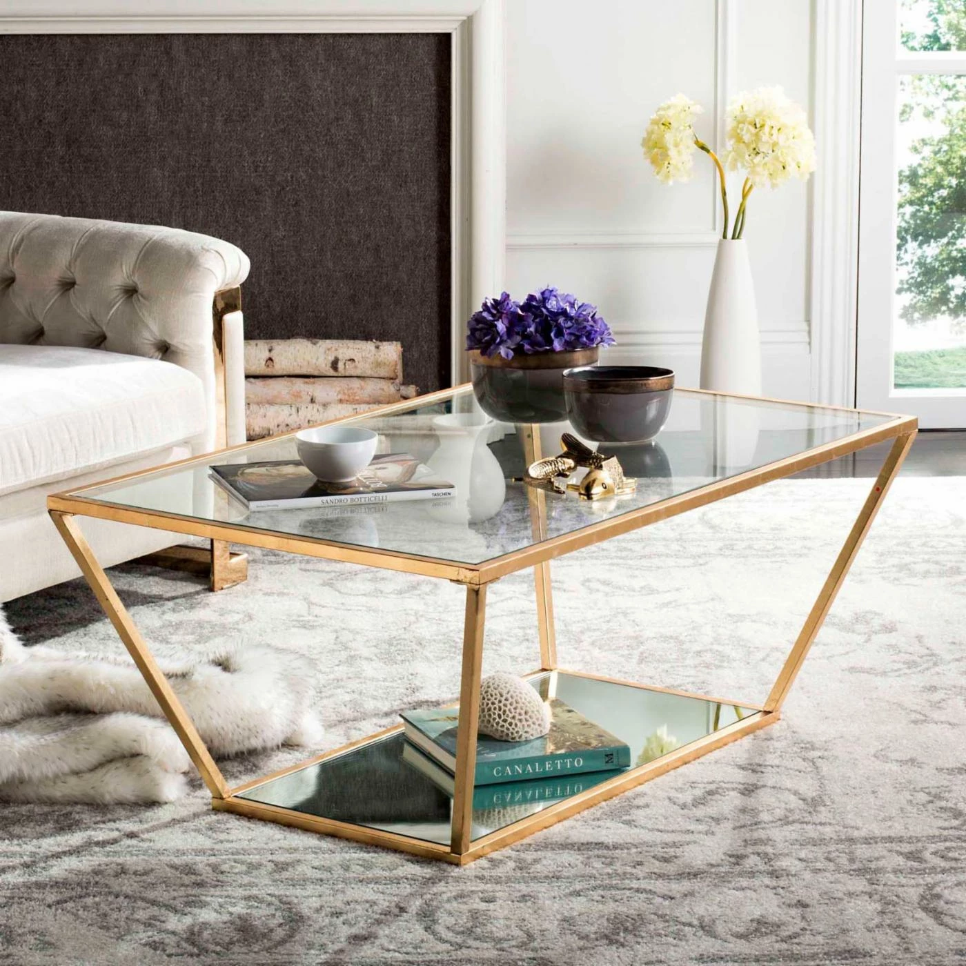 With its sleek, trapezoidal shape, the Safavieh Allene Gold Leaf Retro Coffee Table adds interest to the look of a modern seating area. The durable iron frame of the transitional piece glows with its lacquered gold leaf finish. Clear tempered glass gleams along the top of the table, and the lower shelf features a second panel of glass atop a white panel. You can display decorative items in elegant style within the frame of this chic table.
