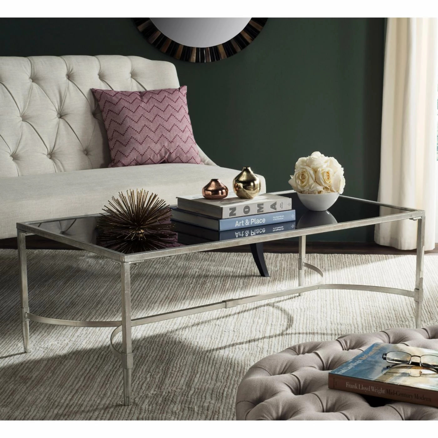 Ideal for transitional and contemporary seating areas, the Safavieh Antwan Coffee Table has a minimalist modern design. The iron frame features straight legs with a gentle taper and a sweeping horizontal stretcher with Y-shaped ends. Black tempered glass is used for the top, giving the table a two-tone look. Choose from available finish options for the legs.