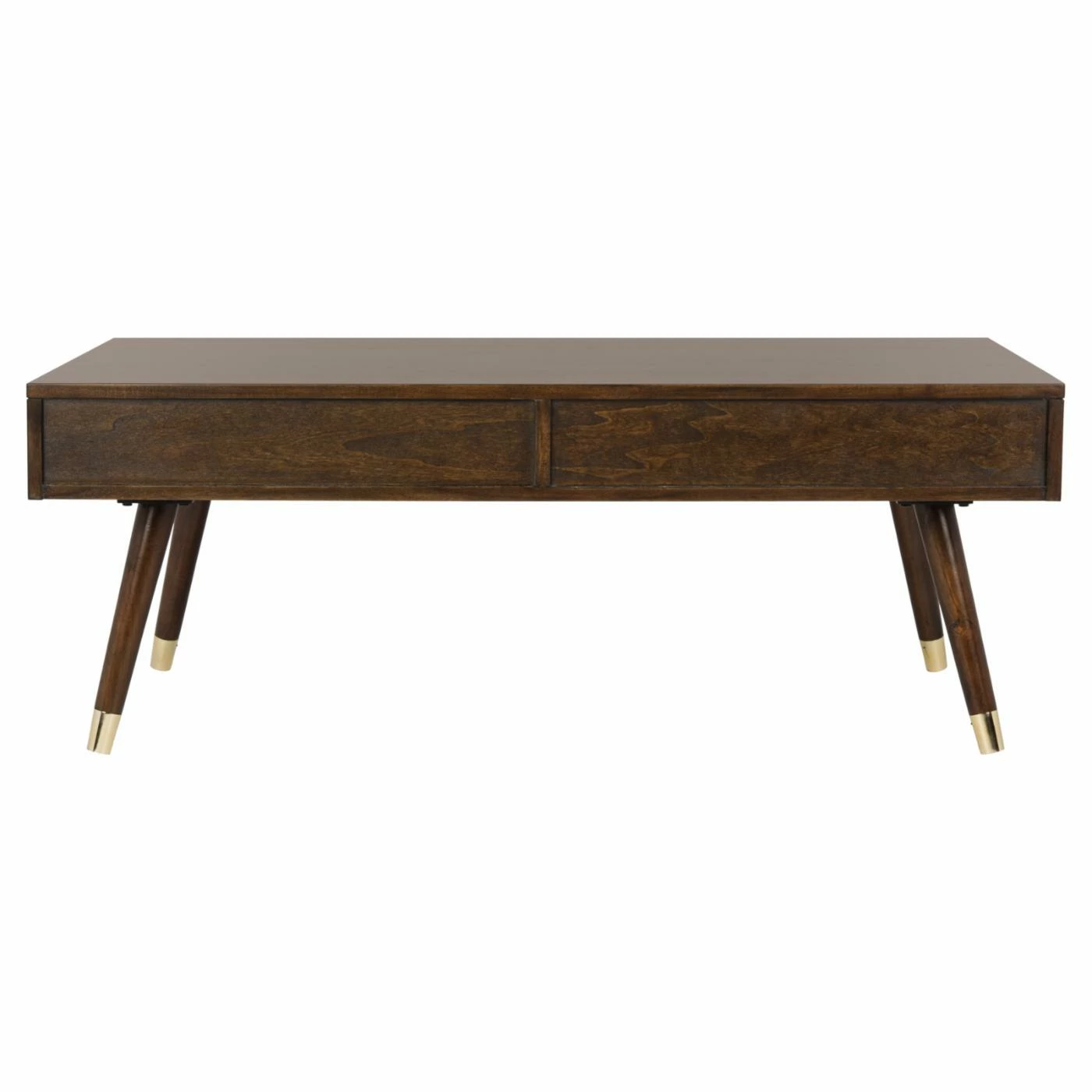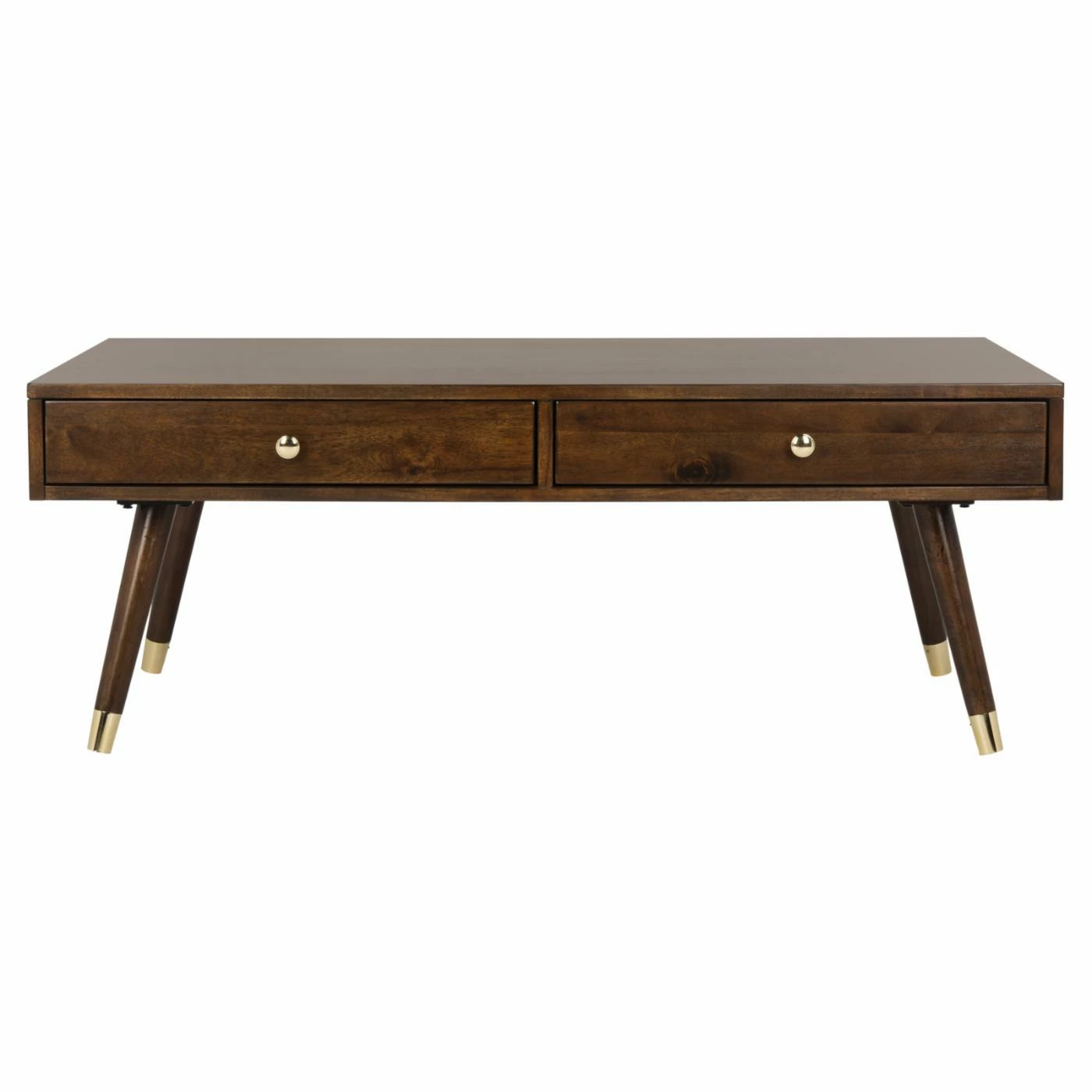 Elevate your mid-century modern seating area with the Safavieh Levinson Coffee Table. The solid rubber wood and engineered wood table offers a timeless retro design with its boxy top and angled round legs. Gold caps and matching gold ball knobs on the dual drawers add a touch of contemporary glamour to the design.