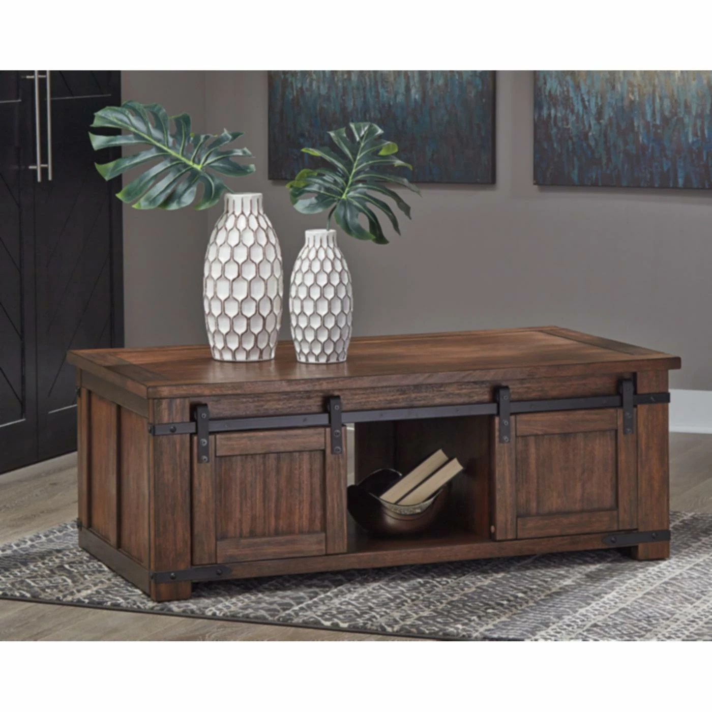 Spruce up your space in southwestern-style furnishings with the Signature Design by Ashley Budmore Rectangular Cocktail Table. This cocktail table is crafted from mango veneers, wood, and engineered wood in a sturdy, reliable build. Double doors slide across the front of this piece to reveal ample storage room for all your home accessories. Black metal hardware offers a chic finishing touch to complement your rustic home dΓ©cor. Easily transport this piece throughout your room with the included bottom casters.