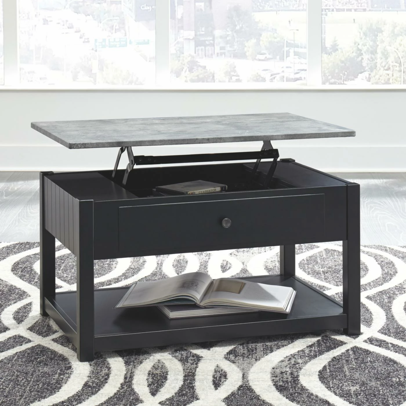 Tidy up your rustic seating area with the Signature Design by Ashley Ezmonei Rectangular Lift Top Cocktail Table. You can hide small clutter out of sight inside the single drawer, which is accessible through the front and by lifting the spring-mounted faux marble tabletop. A lower shelf in the solid and engineered wood base is the perfect place to stack magazines and books.