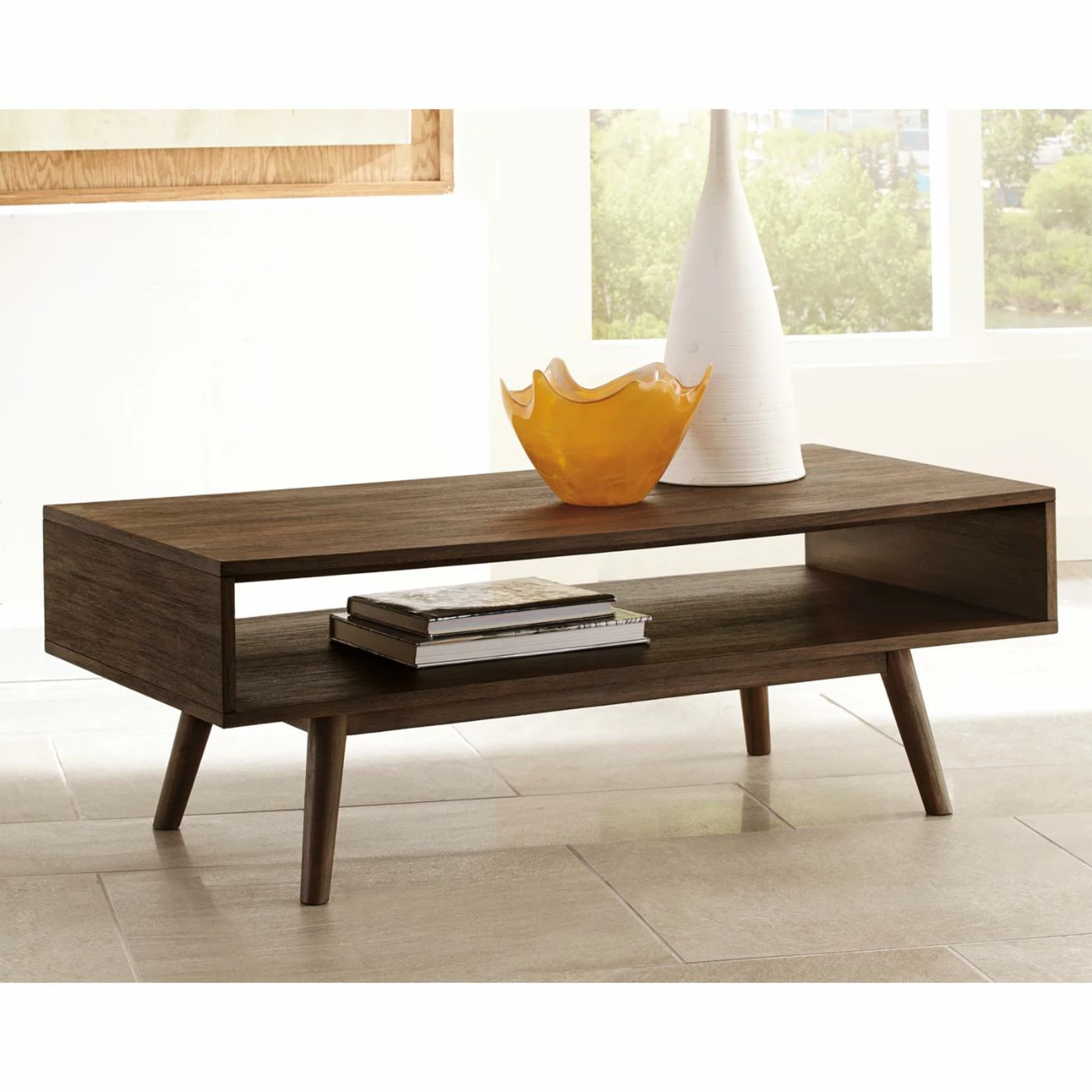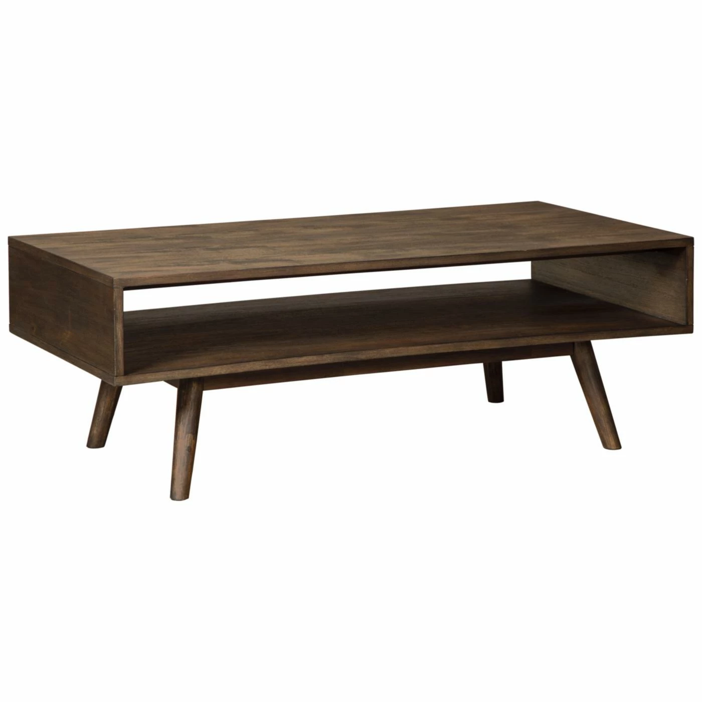 The Signature Design by Ashley Kisper Rectangular Cocktail Table brings mid-century modern into your living room. This straightforward cocktail table features a low, streamlined design with canted peg legs. Crafted from wood and wood veneers in dark brown, this piece easily blends with existing décor. The open shelf offers a convenient display space and keeps the surface free of clutter.