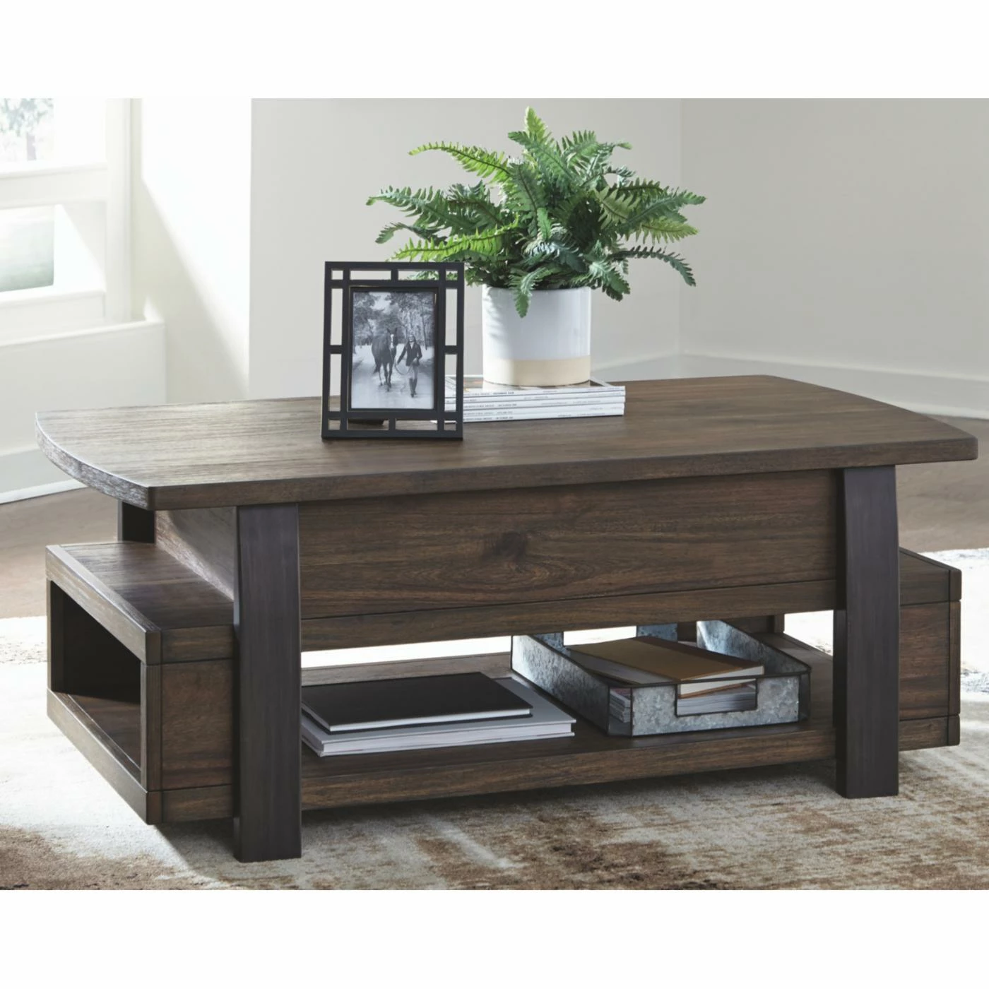 The Signature Design by Ashley Vailbry Lift Top Coffee Table makes a bold statement in form and function. This remarkable table features a multitude of storage spaces, including two side compartments and a lower open shelf. The most stunning feature of this coffee table is the spring-lift tabletop that rises up to reveal even more storage underneath. A grayish brown finish highlights the natural wood grain, setting this up as a piece that is equally at home in a rustic setting or a more modern home. Constructed of veneers, wood, and engineered wood, this coffee table is designed to last.