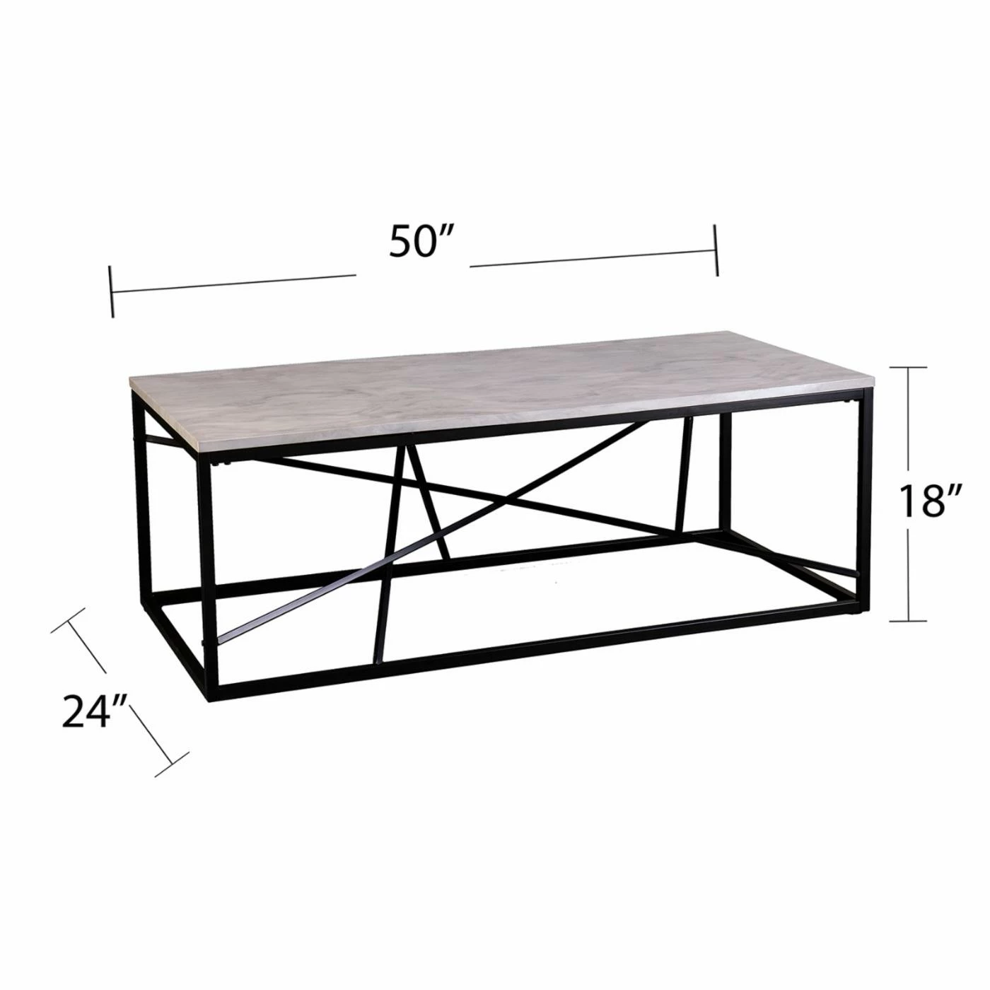 Lend an artistic take and added touches of modern style with the Southern Enterprises Arendale Faux Marble Cocktail Table. Crafted from iron, engineered wood, and ash veneers, this cocktail table has a black frame finish and features a faux marble top in white to complete the look. This tableโs base features angled cross-hatch braces and is fitted with foot protectors to keep your floors free from marring and scratches. This coffee table requires some simple assembly and is covered by a manufacturerโs limited 1-year warranty.