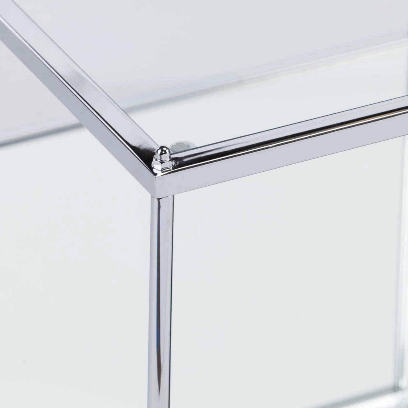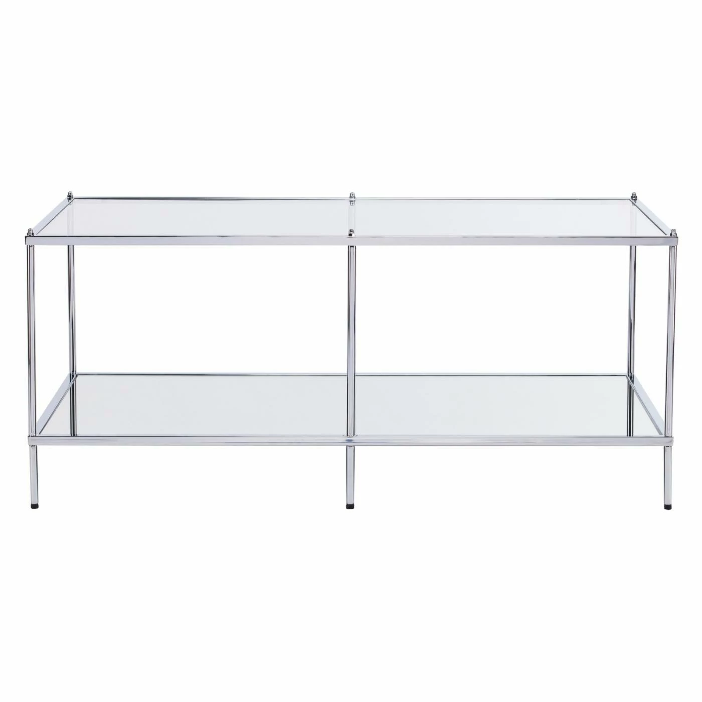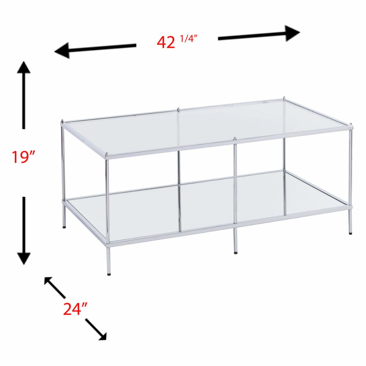 Sleek in silver and designed for modern decor, the Southern Enterprises Knox Glam Mirrored Cocktail Table – Chrome makes your living room shine. This cocktail table features a slim yet strong iron frame in a polished chrome-plated finish. Its rectangular top and lower shelf are made of tempered mirrored glass, perfect for displaying personal items that reflect your chic style.