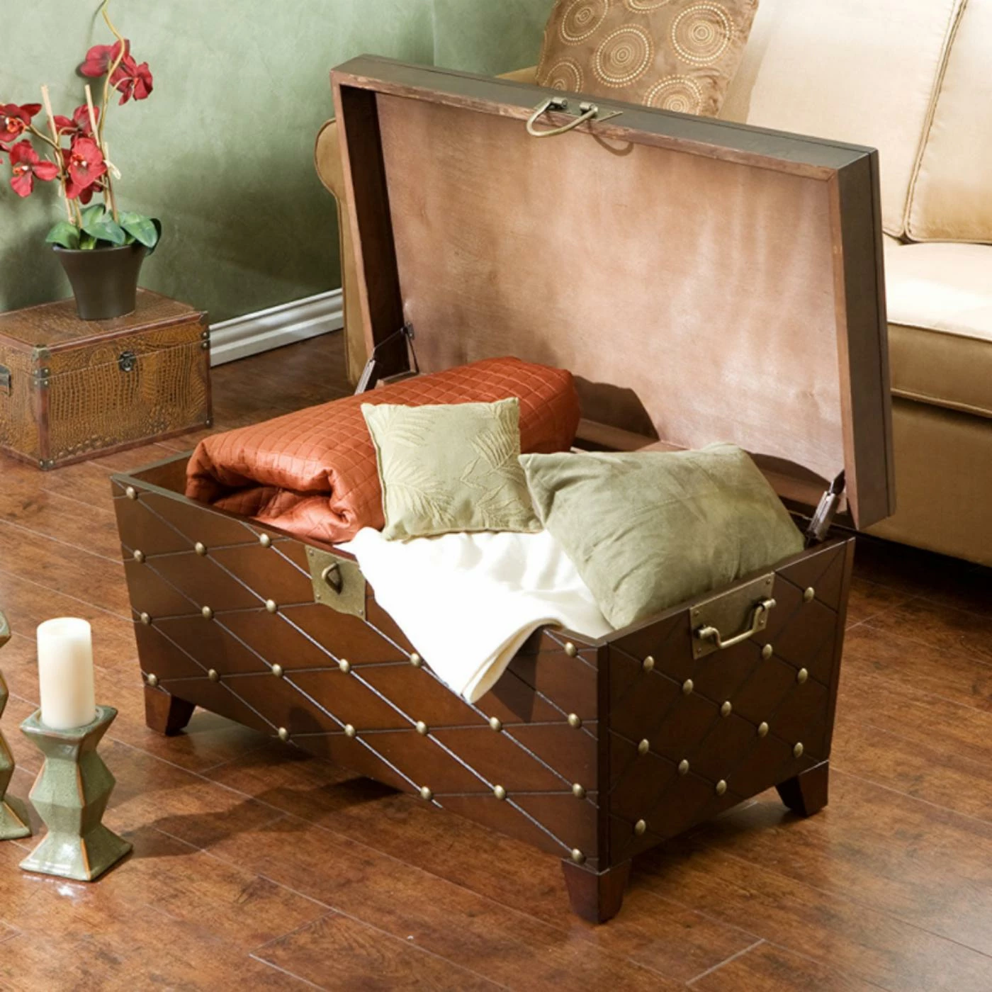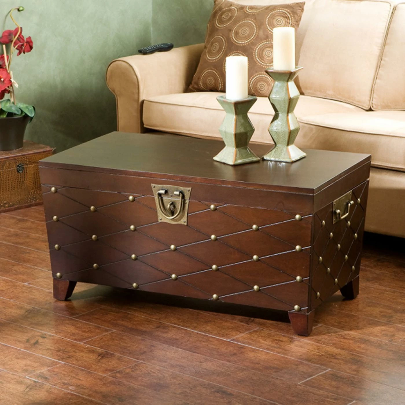 Cool coffee table. That’s what your guests will say when they see the Espresso Nailhead Coffee Table Trunk. Its head-turning design features antique gold-finished nailheads placed at the intersections of the grooved diamond pattern. This coffee table offers chic, worldly appeal and plenty of usefulness. There’s ample room on the sturdy flat top for refreshments or reading material. The sturdy lid opens to reveal a large storage area for pillows, blankets, magazines, and other items. Durable metal hardware, handles, and a decorative padlock latch round out the piece. Assembly required. Tip: You can pair the coffee table with the matching Espresso Nailhead End Table Trunk for a complete set.