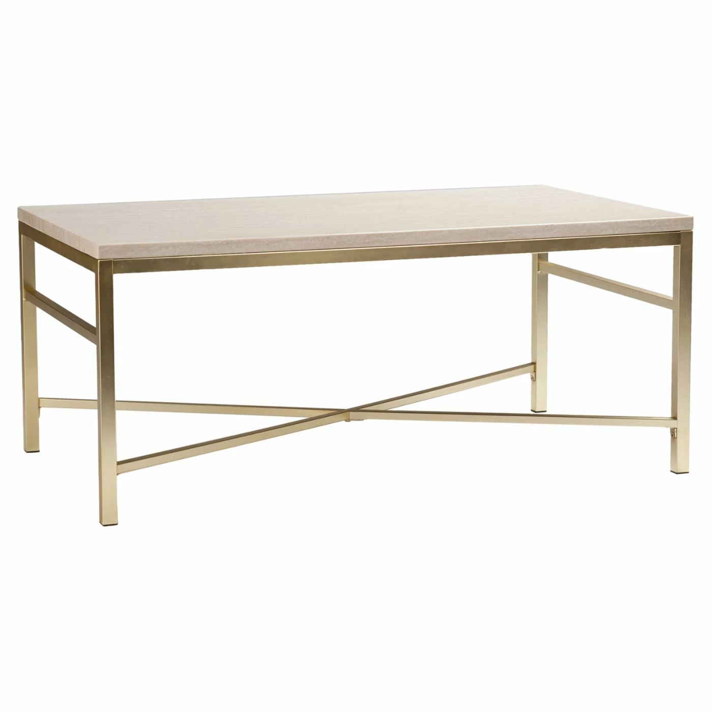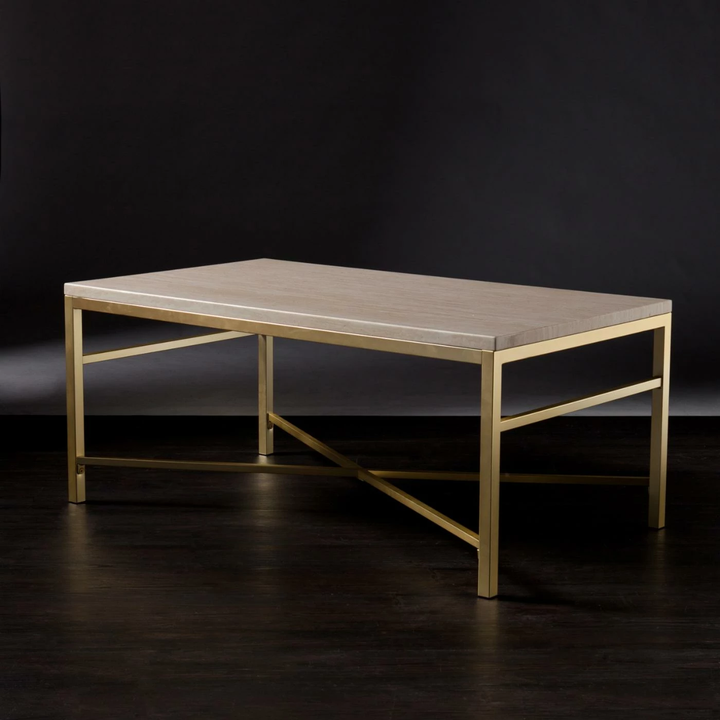 Curate your own contemporary furniture art collection with the sophisticated Southern Enterprises Orinda Cocktail Table. This glamorous cocktail table has a sleek, linear frame with side bracers, an X stretcher, and a timeless matte brass finish. It’s topped with cream colored faux travertine stone that adds a lush, modern organic feel.