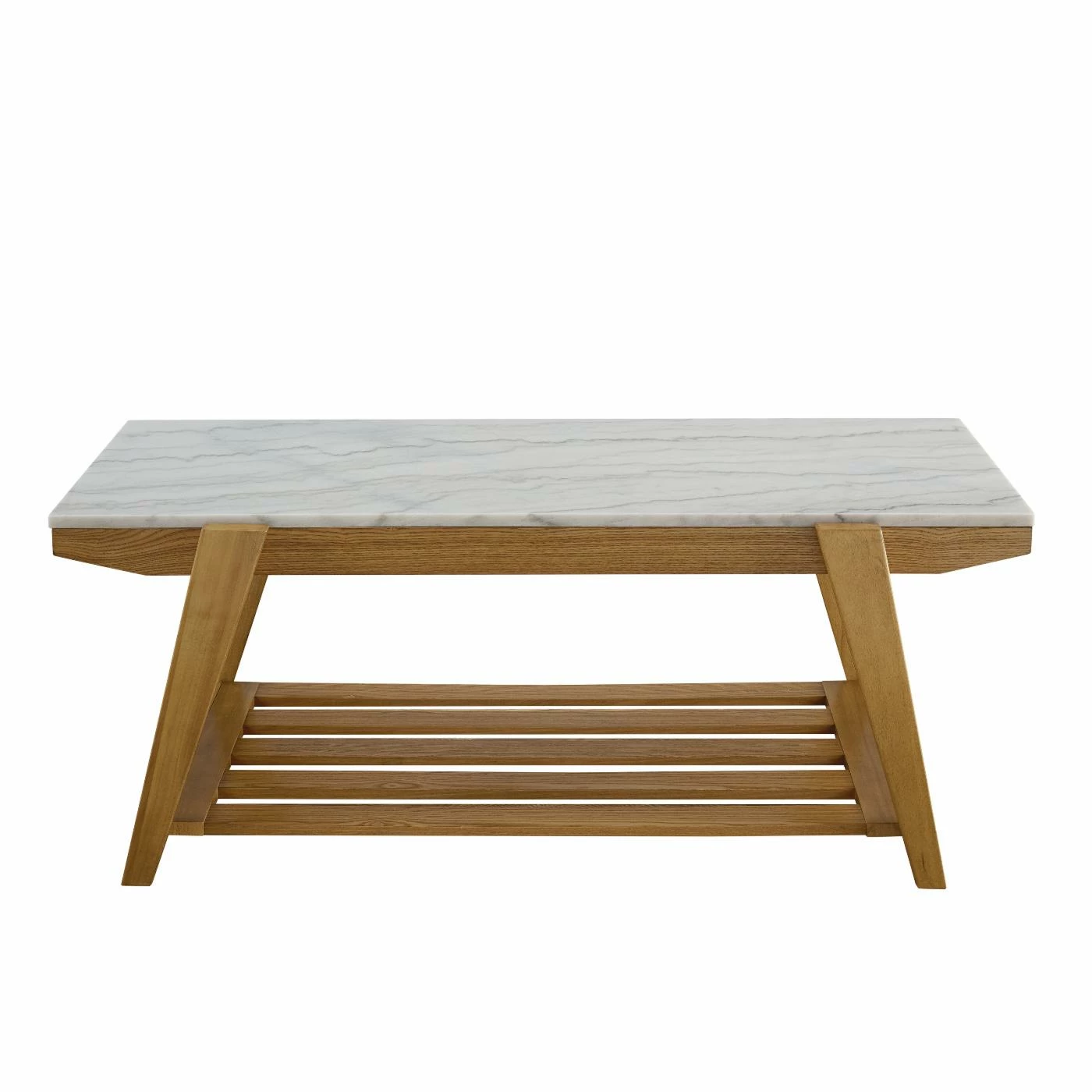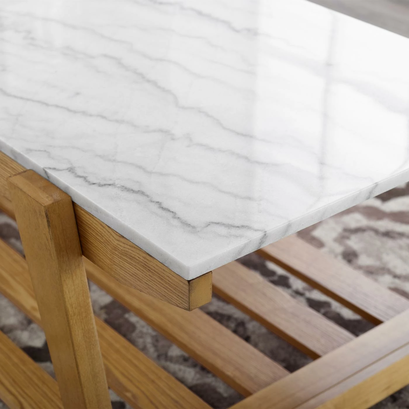 Clean lines and a blend of mediums make the Steve Silver Co. Celeste Marble Top Cocktail Table a modern stunner. This cocktail table features a birch veneers and hardwood solid base that sports a warm natural hue. The warm finish of the wood is becomingly paired with a white marble top with mineral accents. Canted legs and a slatted bottom shelf lend further fetching function to the design.