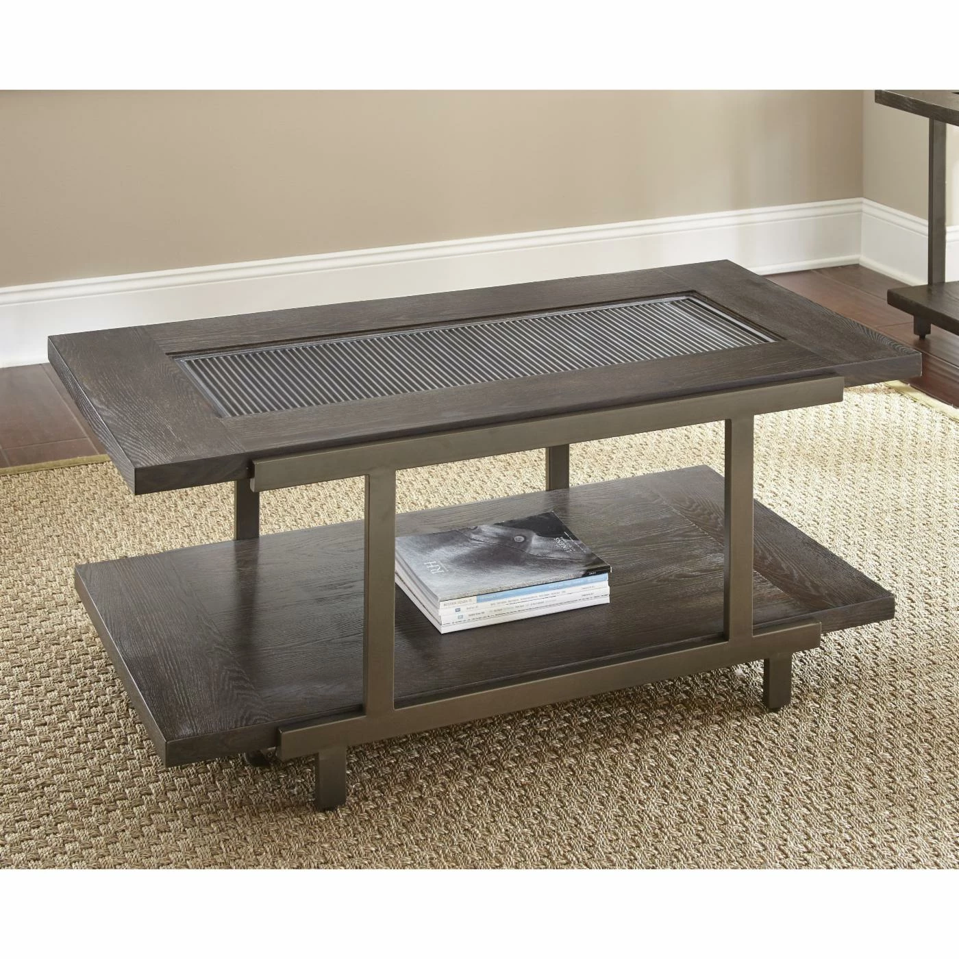 The architectural styling of the Steve Silver Co. Terrell Cocktail Table with Casters adds a bold presence to your living space. Perfect for modern and contemporary décor styles, this cocktail table features an angular iron frame and ash veneers in a smoky brown finish. The lower shelf is ideal for storing a stack of magazines or a few board games, and the top features a tempered glass insert with an industrial-inspired corrugated metal underlay. And when it’s time to vacuum or sweep, this cocktail table’s hidden casters make for easy mobility.